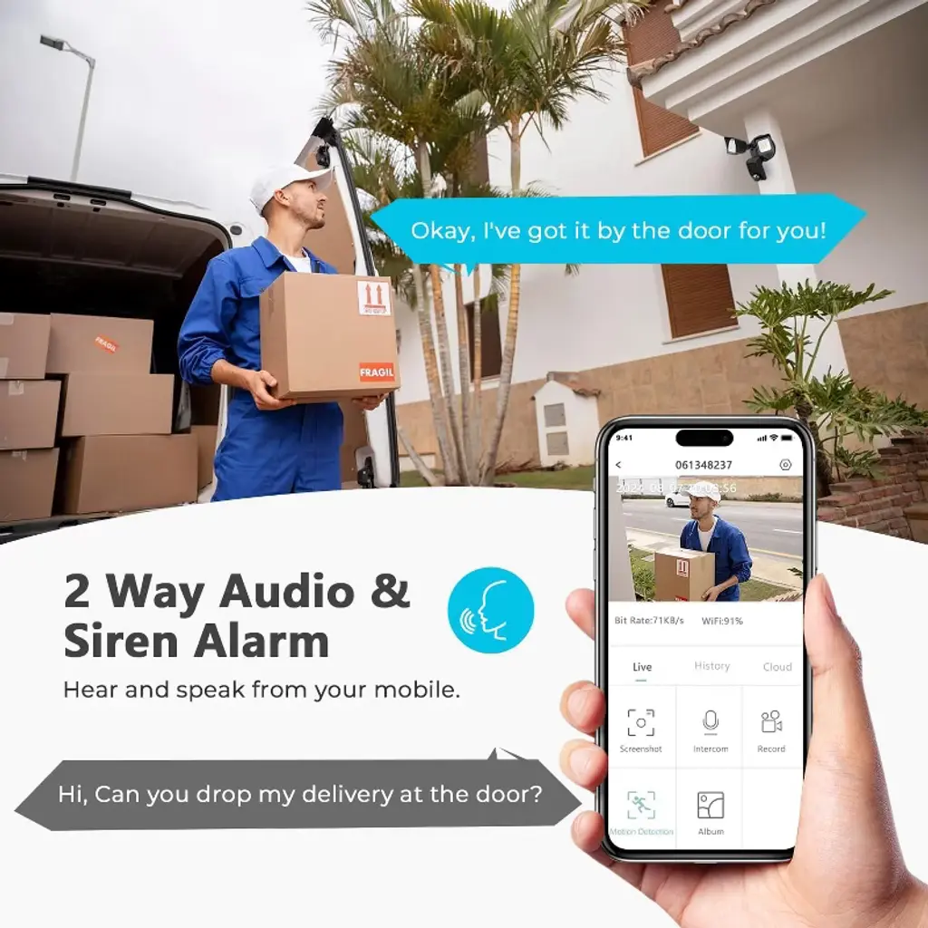 Motion Sensor Outdoor Lights, Floodlight Camera with High-Performance Video and Audio Utilizes H.264 compression for efficient storage, supports adjustable bit rates ranging from 32Kbps to 1.5Mbps. Boasts 110dB alarm volume, dual-stream capability, and built-in microphone for seamless audio monitoring.