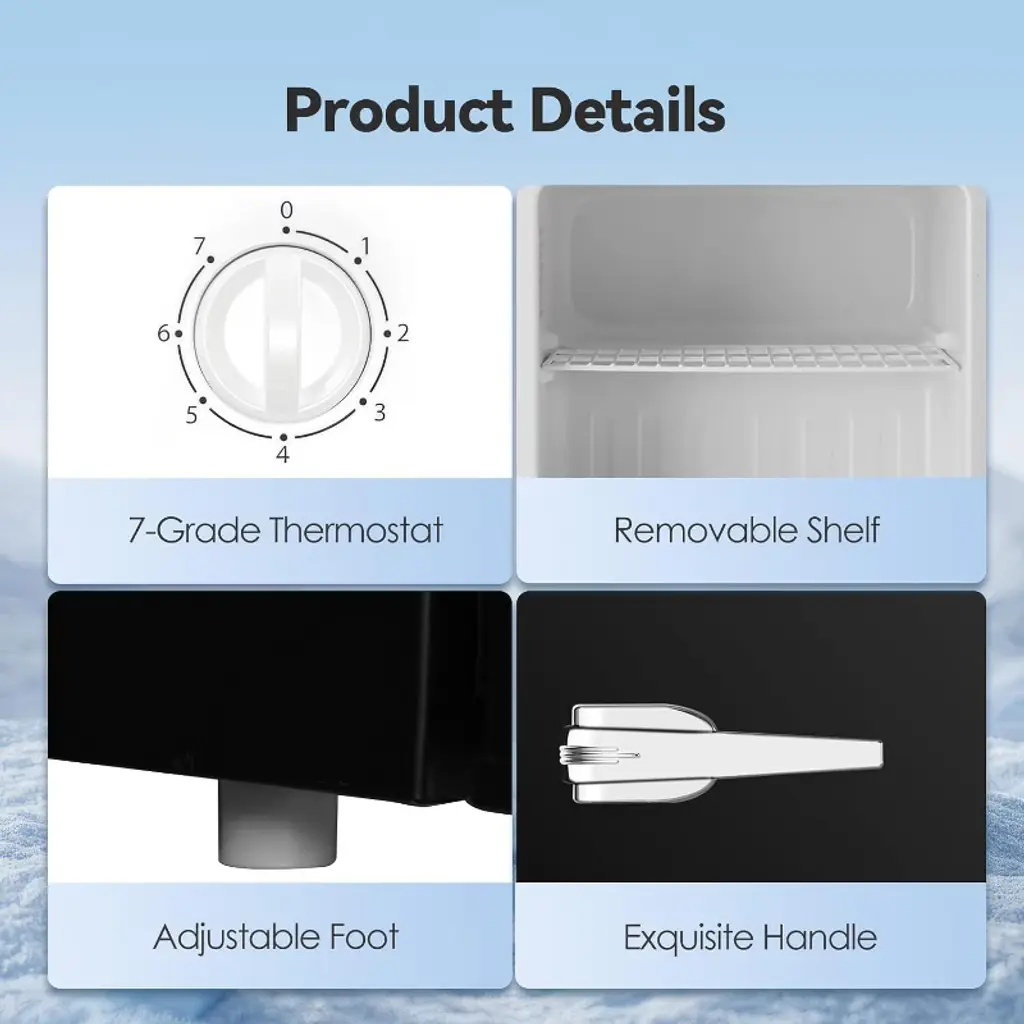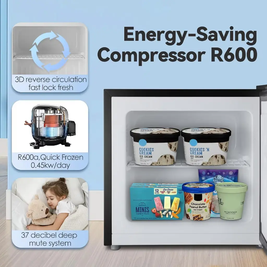 Compact 1.2 Cu.Ft Mini Freezer ,Space-saving 19.7" cube with surprising storage capacity. Features 7 temperature settings (-13°Fto 28°F), energy-efficient operation (0.45kWh/day), and quiet 40dB performance. Perfect for homes, dorms or small businesses with adjustable shelves and quick-cool technology.