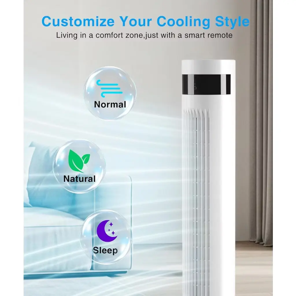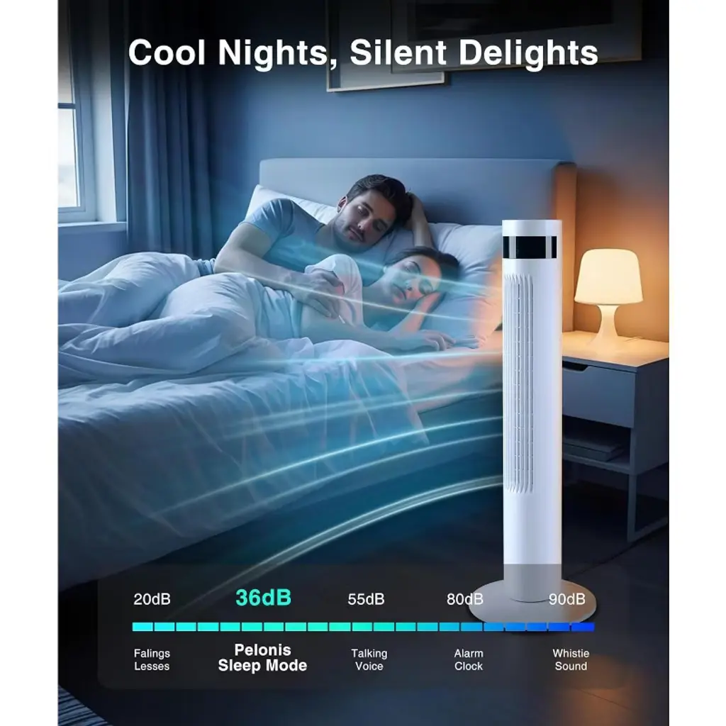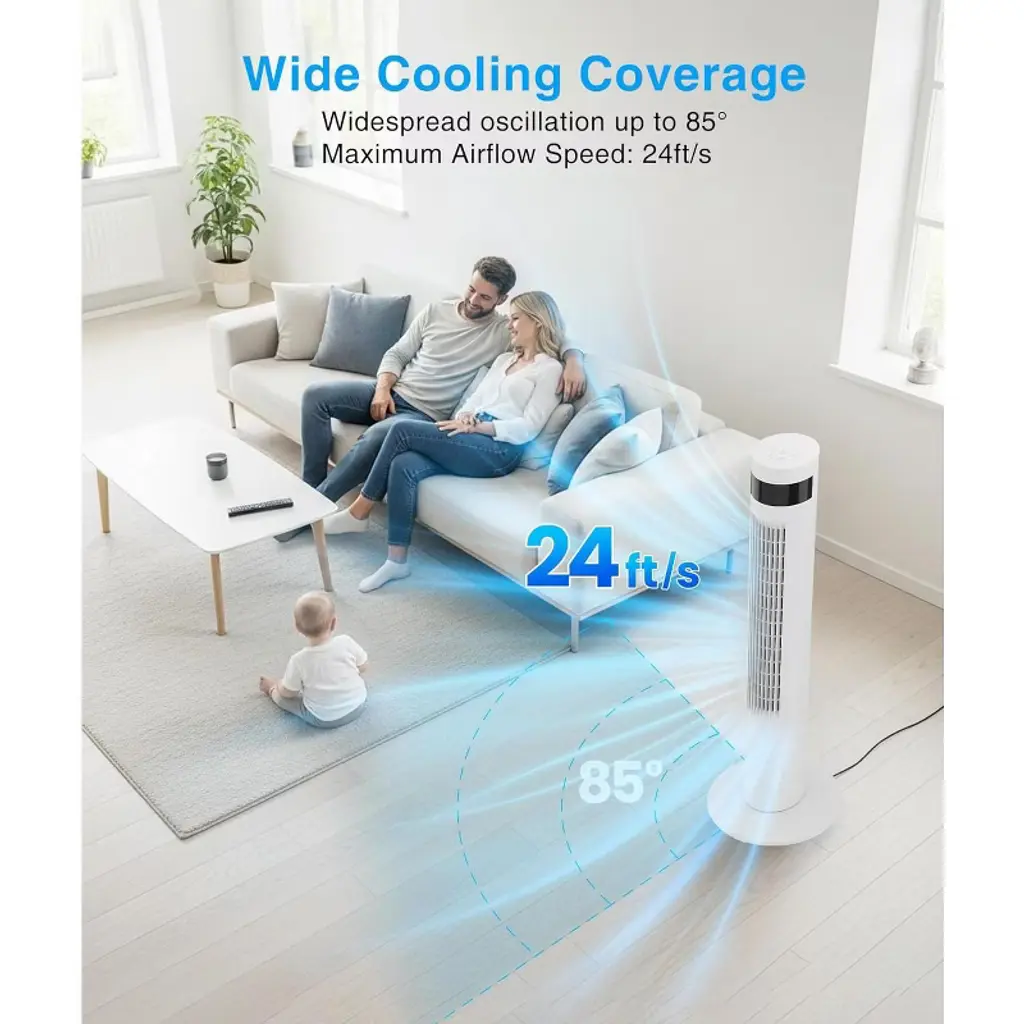 Stay comfortably cool with this powerful 36-inch oscillating tower fan that delivers instant cooling throughout your space.Its 85° wide-angle rotation and high-speed 24ft/s airflow create a refreshing breeze perfect for any room. Choose from 3 speed settings and 3 modes (Normal/Sleep/Natural) .All easily controlled with the included remote.The fan operates at just 36dB thanks to its innovative air-duct system, while the 12-hour timer ensures automatic shut-off for undisturbed sleep.