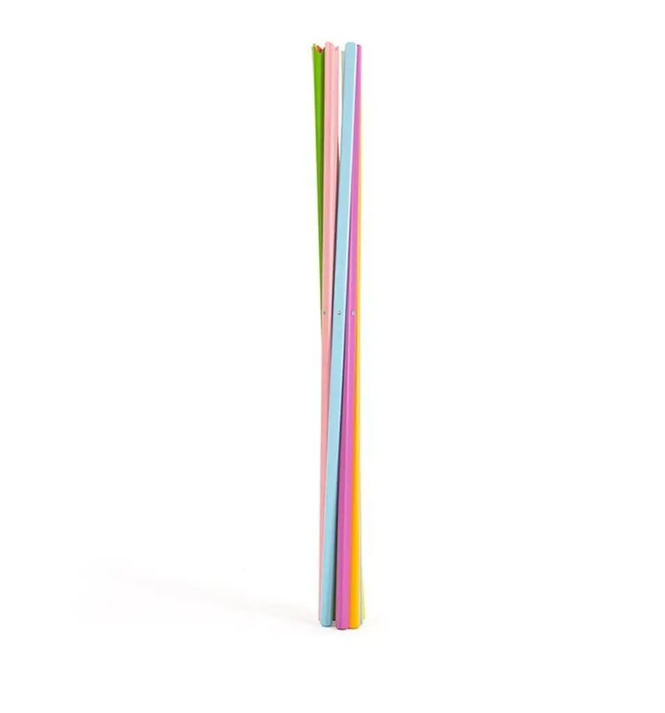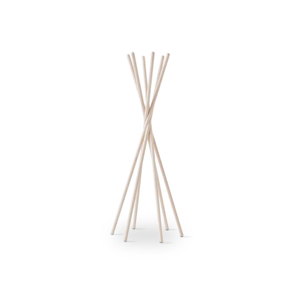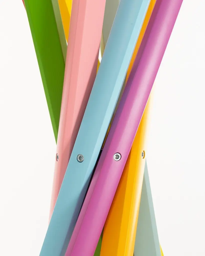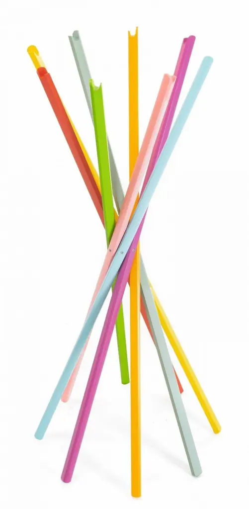 Folding and adjustable clothes-stand. Multicoloured lacquered beech frame. Numbered edition.Sciangai - the iconic folding coat stand design by De Pas, D’Urbino and Lomazzi in 1973, winner of the Compasso d’Oro award in 1979 - celebrates its 50th anniversary. Zanotta celebrates this milestone anniversary with Paolo Lomazzi by creating a special unlimited numbered edition: introducing Sciangai 50, an explosion of bright and joyful colours.Sciangai 50 is a faithful replica of the original sketch found in De Pas, D’Urbino and Lomazzi’s studio by Fabio Calvi and Paolo Brambilla, Zanotta’s new Art Directors, a brightly coloured pencil drawing where each rod has a different shade. An empathic and communicative object that customises its surroundings with a touch of playful authentic anti-conformism as its eight colourful branches open out. “Objects need to form a friendly rapport with their users while also being easy to use”. Paolo LomazziA folding clothes stand with a highly elementary yet user-friendly operating mechanism that draws its inspiration from the Mikado pick-up sticks game. In Sciangai, each element forms a point of contact with the ground and, at the same time, provides somewhere to hang a coat or a hat at the top, the tips specifically shaped to hold onto each garment or item of headwear. The eight solid beech-wood sticks are connected together by a joint a little above the middle and when they are open, they create an adjustable circumference to suit the surrounding available space, creating a coat stand of varying dimensions.