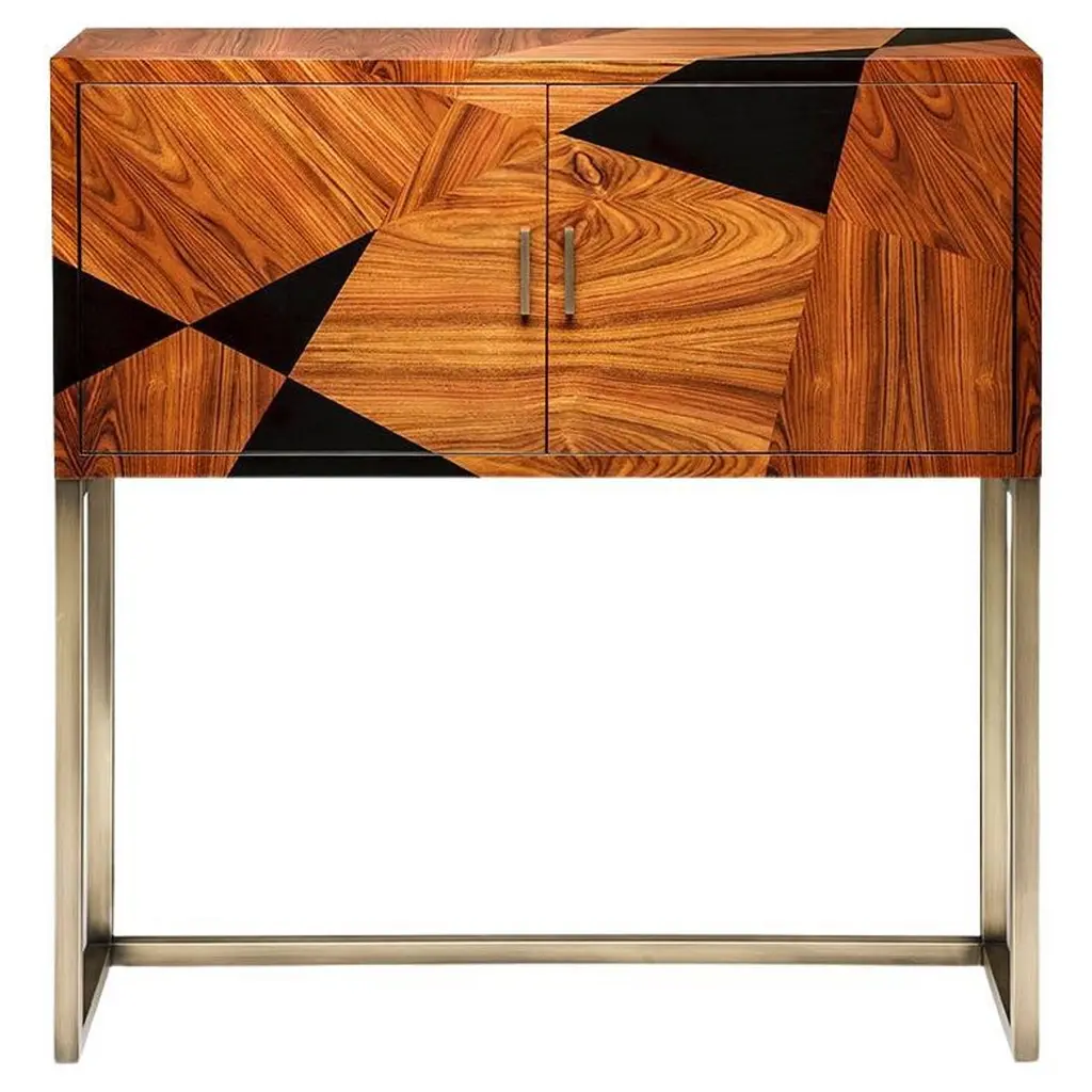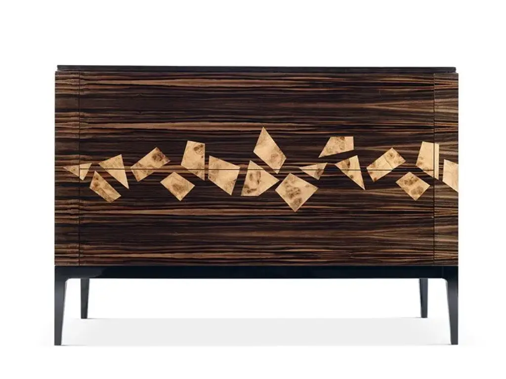 Night compositions series. Frame in blockboard and multi-ply with ebony veneer for the exterior and interior. The top is available in ebony veneered hollow core or in marble from the samples available. The drawers have concealed runners fitted with the silent close system. The top interior is upholstered in leather. The base frame is in lacquered solid tulipier.
