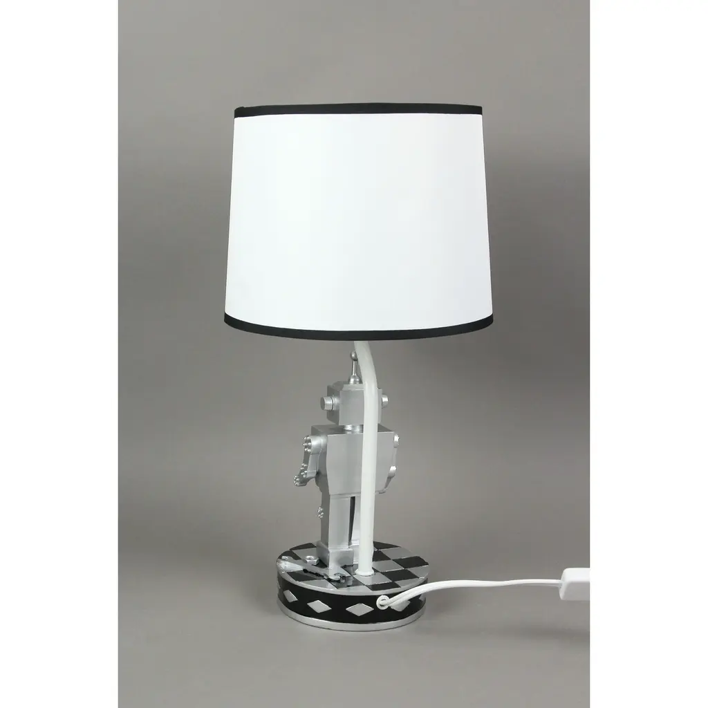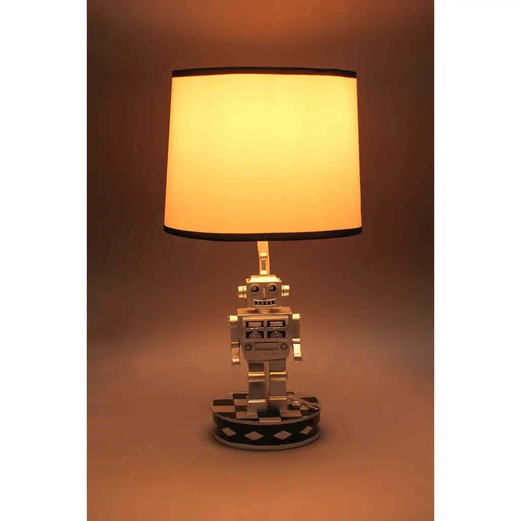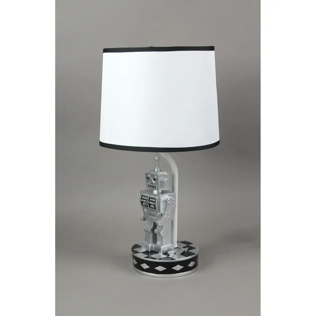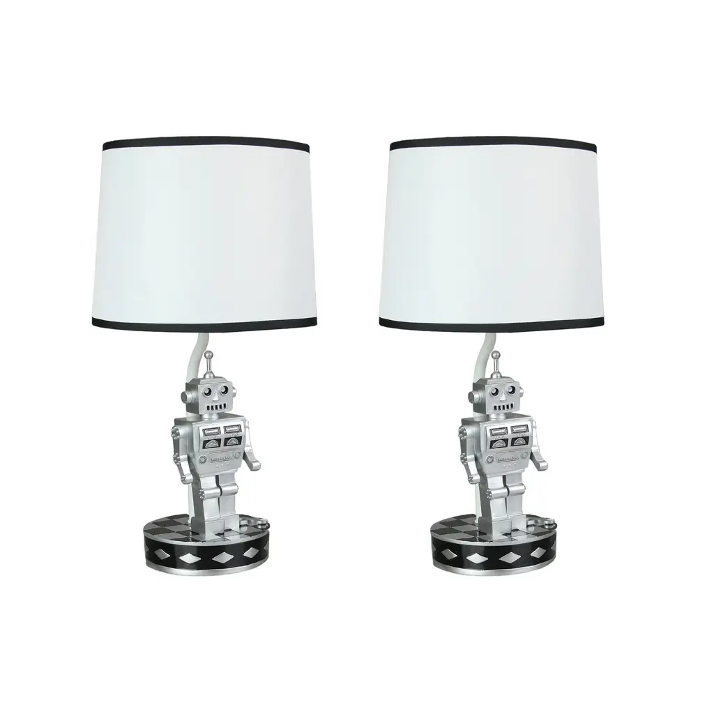 This pair of cool bedroom table lamps features 6-inch tall metallic silver 1960's style robots on the bases. Great for science fiction fans and 60's B movie lovers. Each lamp measures 16.5 inches tall, with its navy blue and white, 9-inch diameter shade. They use standard incandescent (40-watt) or LED (13-watt) light bulbs, and each comes with a 59-inch long cord with a toggle on/off switch.