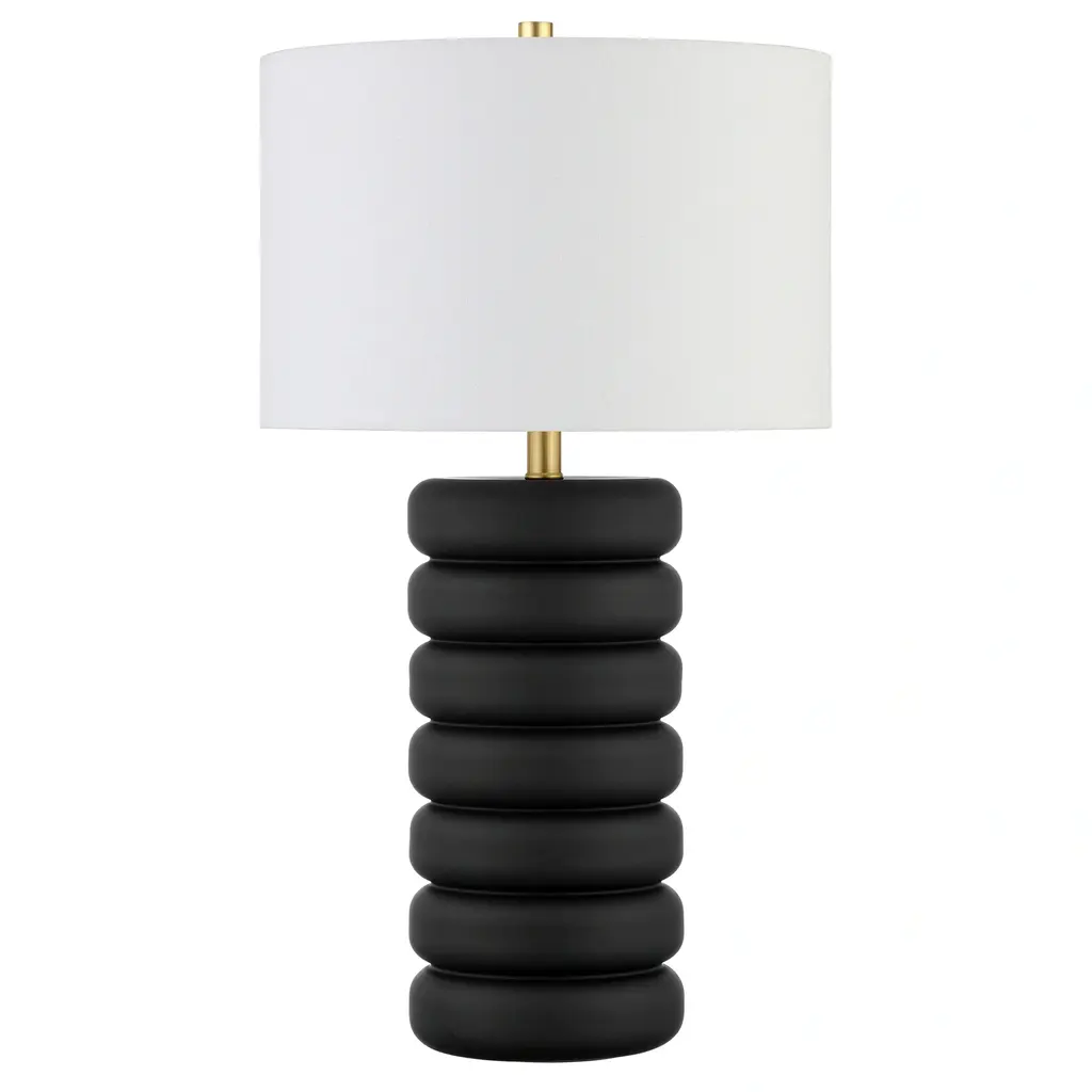 Update your bedside, mantle, or hall table styling with this textural table lamp. The jar-shaped base is made of stacked glass rings, creating an textured feel to the fixture. Accented with a lustrous brass downstem and a crisp linen shade, this lamp is the perfect piece anywhere you need to shed a little extra light.