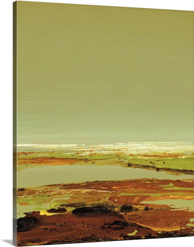 Gallery-Wrapped Canvas entitled 'Zen Land'. This soothing wall art for the home or office is an abstract painting of streaks and swaths of color that look like a sunrise reflecting in water. Multiple sizes available. Primary colors within this image include: Brown, Black, Light Gray. Made in the USA. All products come with a 365 day workmanship guarantee. Inks used are latex-based and designed to last. Canvases have a UVB protection built in to protect against fading and moisture and are designed to last for over 100 years. Museum-quality, artist-grade canvas mounted on sturdy wooden stretcher bars 1.5" thick. Comes ready to hang.