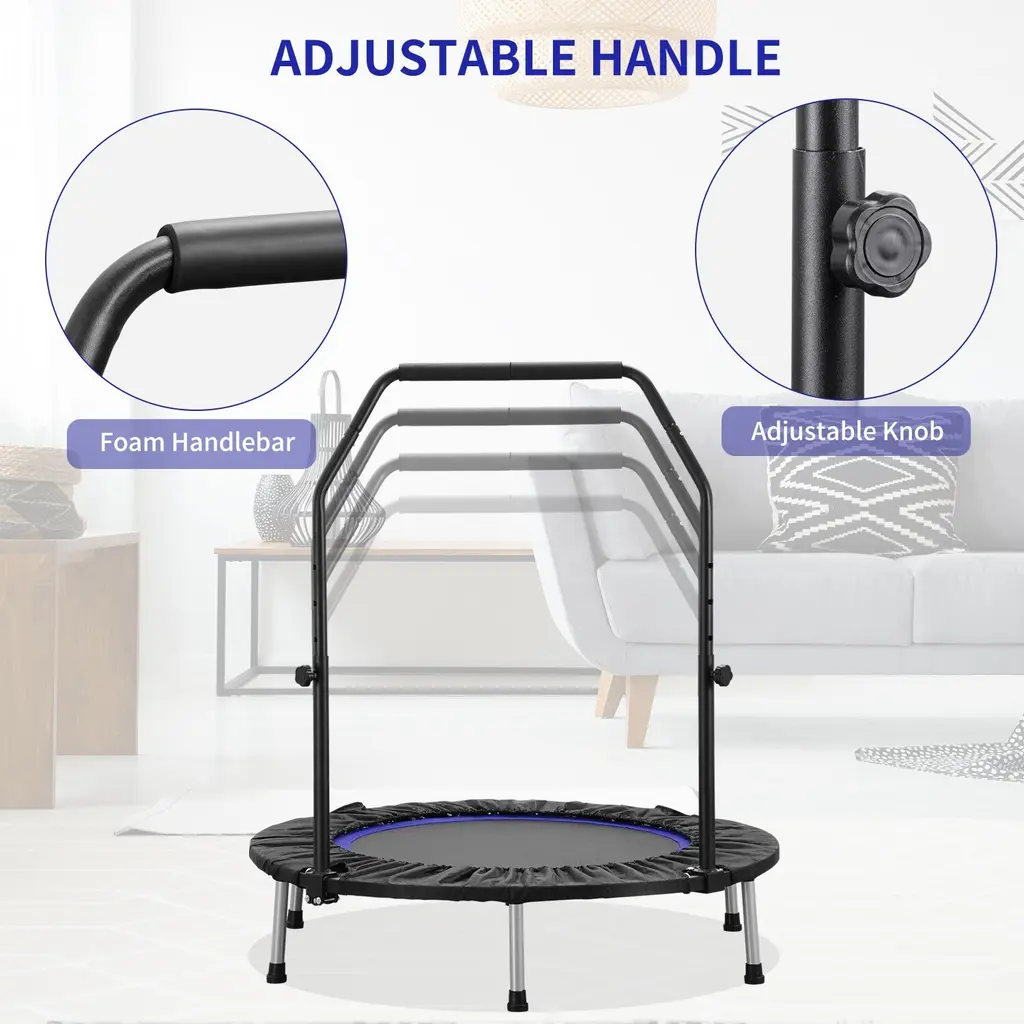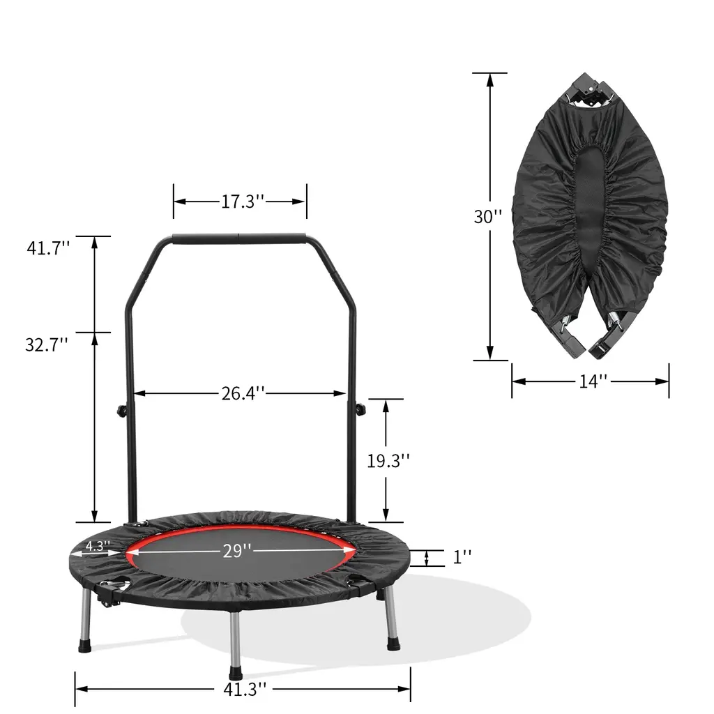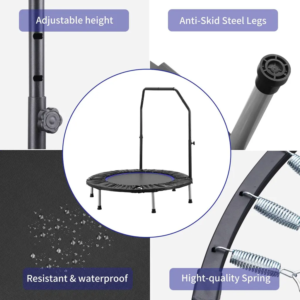 The Mini Trampoline is made of High-quality Alloy Steel Frame and Premium PP jumping mat and PVC safe pad cover, which are all designed for providing you a better jumping experience while ensuring the safety. Four levels adjustment is suit for both kids and adults. Our Mini Fitness Trampoline could exercise full body and perform aerobic workouts at home and it is foldable and portable to carry outside.It has an adjustable handle bar, suitable for children and adults use. You will have fun with the trampoline, continuous jump can consume body fat,10 Minutes bounce exercise equals 30 minutes yoga, 60 minutes walking or 20 minutes swimming. Provide a more fun way to keep fit. Feature: Get a Fitness Trampoline. Take the Flowing BenefitsBurn calories, lose weight & build musclePromote cardiovascular health & metabolismImprove balance and coordinationIncrease oxygen content & Improve bone densityHelp children grow and developSpecifications:Material: PP, Alloy Steel, PVC Spring Quality: 32Handrail: 4-levels in adjustable Trampoline Diameter: 40inchJump Mat Diameter: 28inchNet Weight: 24 LBSWeight Capacity: 330 LBSPart List:Trampoline x1 Legs x6 Protective Cover x1Accessories Bag x1Packing Bag x1Pole x5Manual x1