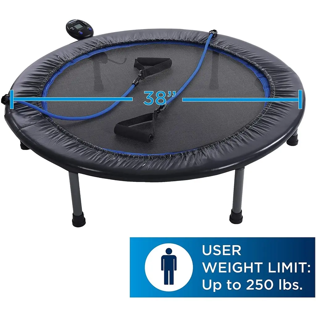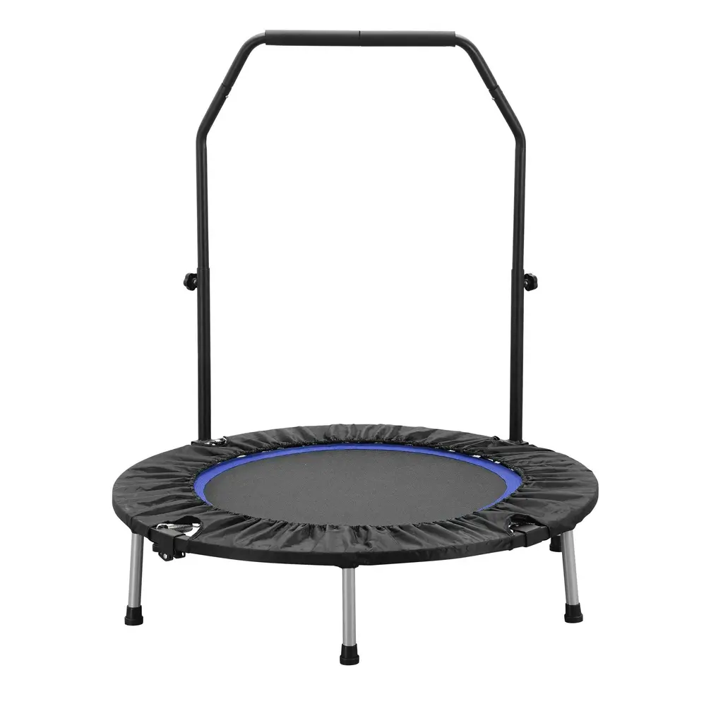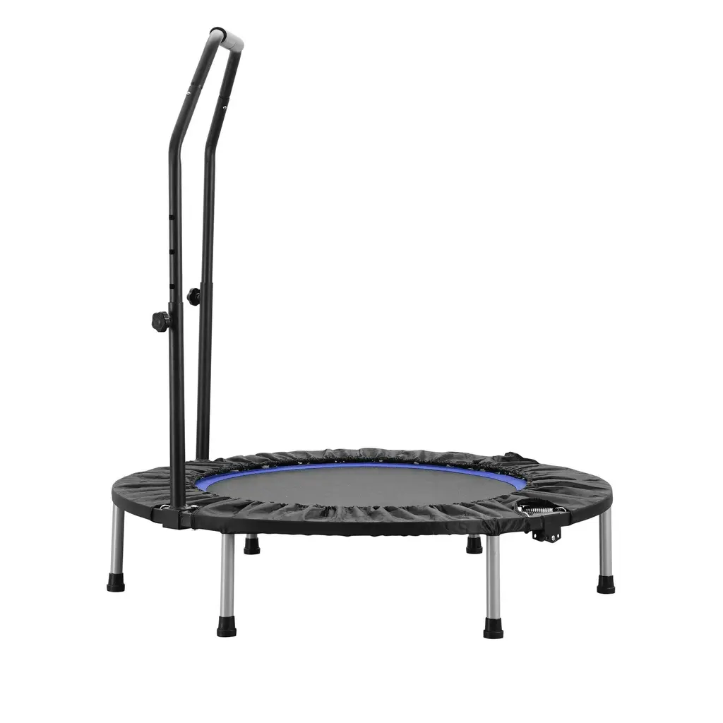 The Mini Trampoline is made of High-quality Alloy Steel Frame and Premium PP jumping mat and PVC safe pad cover, which are all designed for providing you a better jumping experience while ensuring the safety. Four levels adjustment is suit for both kids and adults. Our Mini Fitness Trampoline could exercise full body and perform aerobic workouts at home and it is foldable and portable to carry outside.It has an adjustable handle bar, suitable for children and adults use. You will have fun with the trampoline, continuous jump can consume body fat,10 Minutes bounce exercise equals 30 minutes yoga, 60 minutes walking or 20 minutes swimming. Provide a more fun way to keep fit. Feature: Get a Fitness Trampoline. Take the Flowing BenefitsBurn calories, lose weight & build musclePromote cardiovascular health & metabolismImprove balance and coordinationIncrease oxygen content & Improve bone densityHelp children grow and developSpecifications:Material: PP, Alloy Steel, PVC Spring Quality: 32Handrail: 4-levels in adjustable Trampoline Diameter: 40inchJump Mat Diameter: 28inchNet Weight: 24 LBSWeight Capacity: 330 LBSPart List:Trampoline x1 Legs x6 Protective Cover x1Accessories Bag x1Packing Bag x1Pole x5Manual x1
