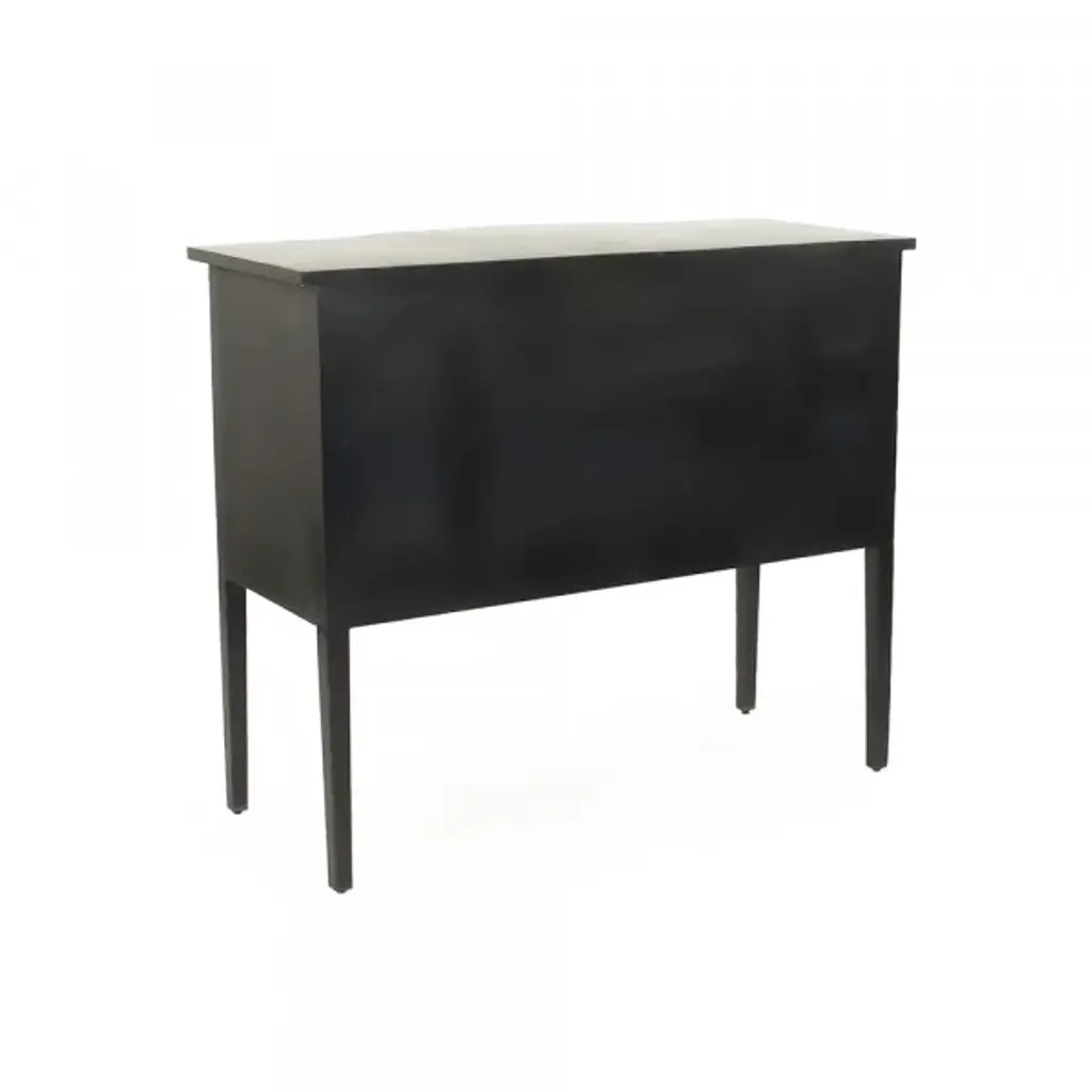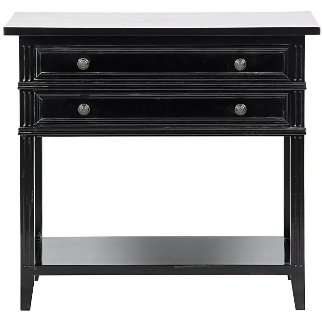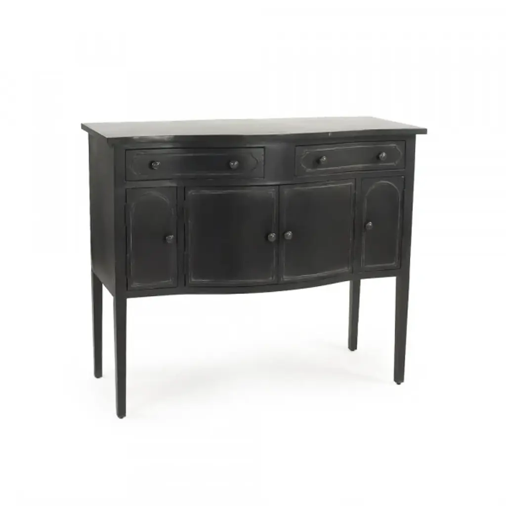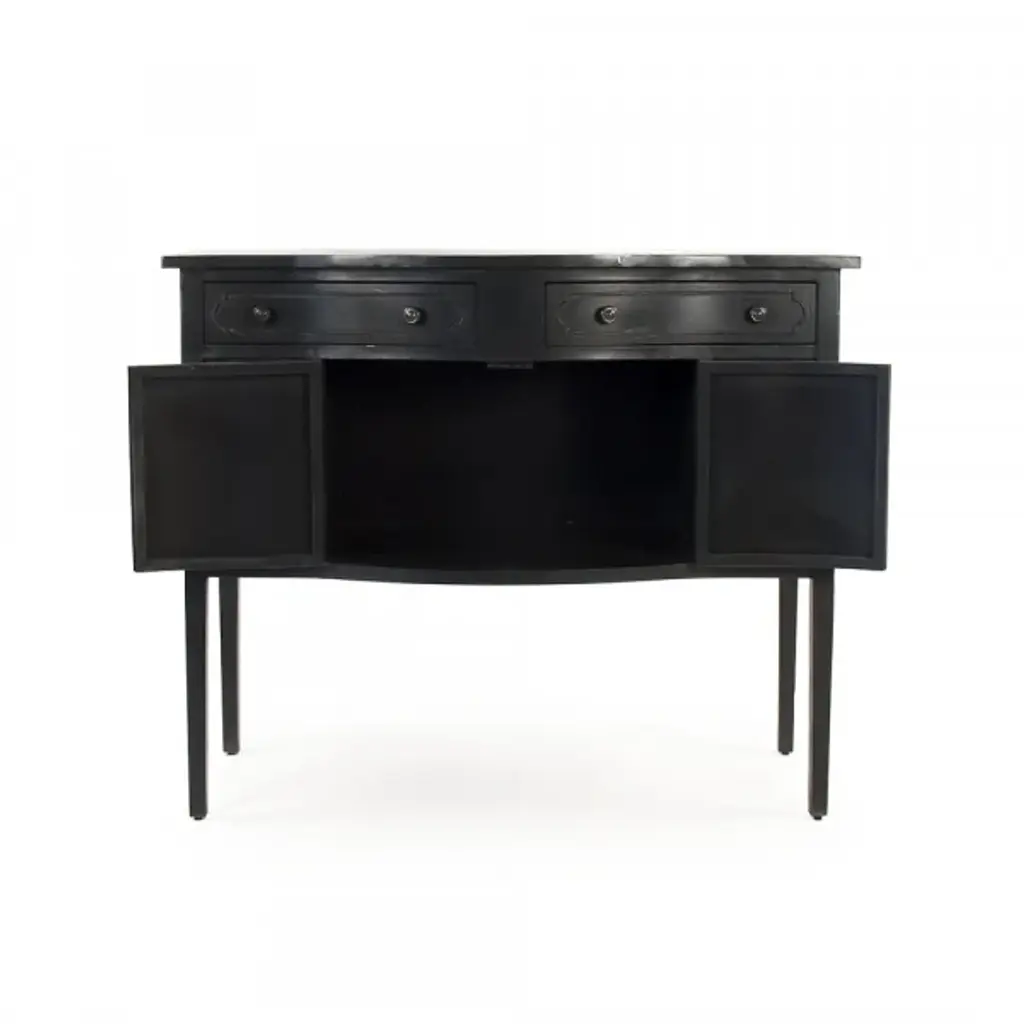 Sure to be a showstopper in any room, this antique black console by Zentique features double drawers and shelves enclosed by doors with dark metal knobs.