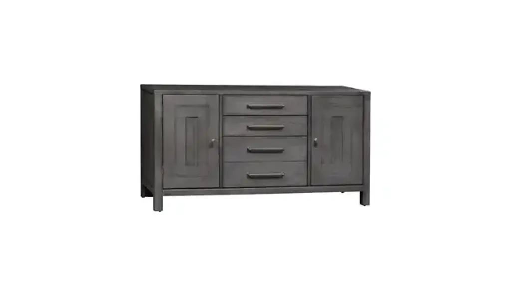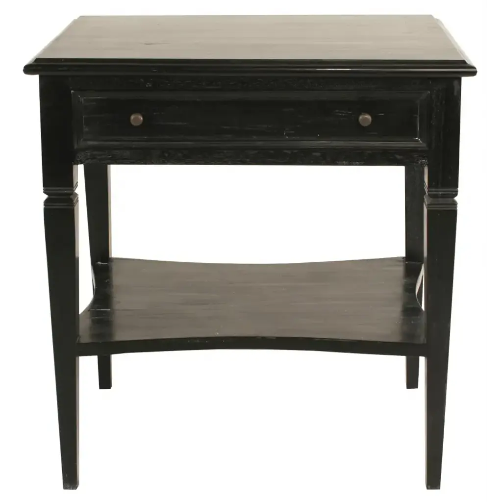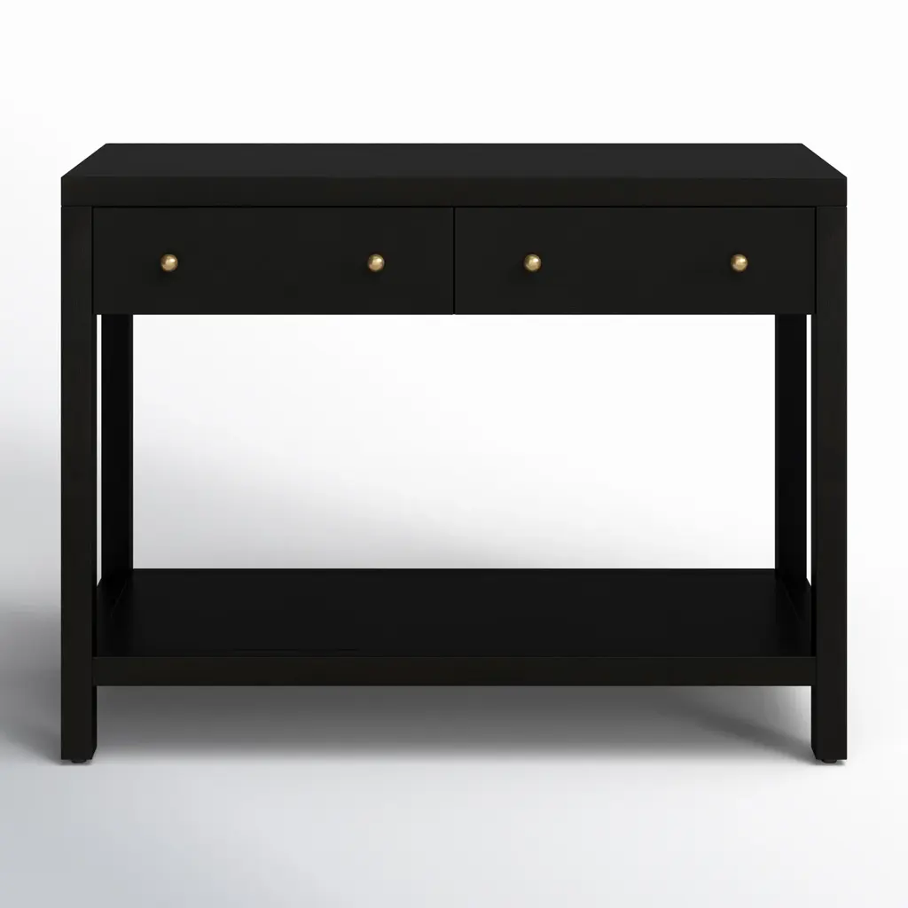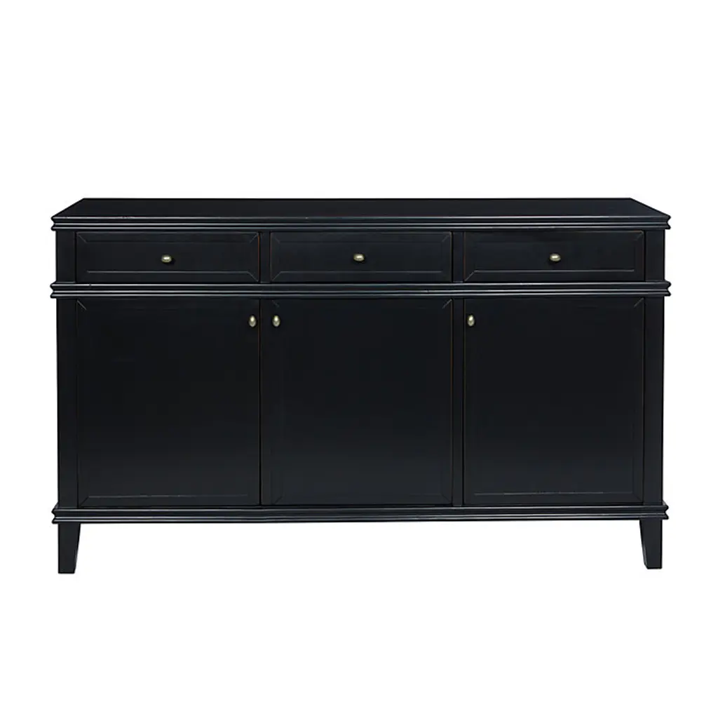 Sure to be a showstopper in any room, this antique black console by Zentique features double drawers and shelves enclosed by doors with dark metal knobs.
