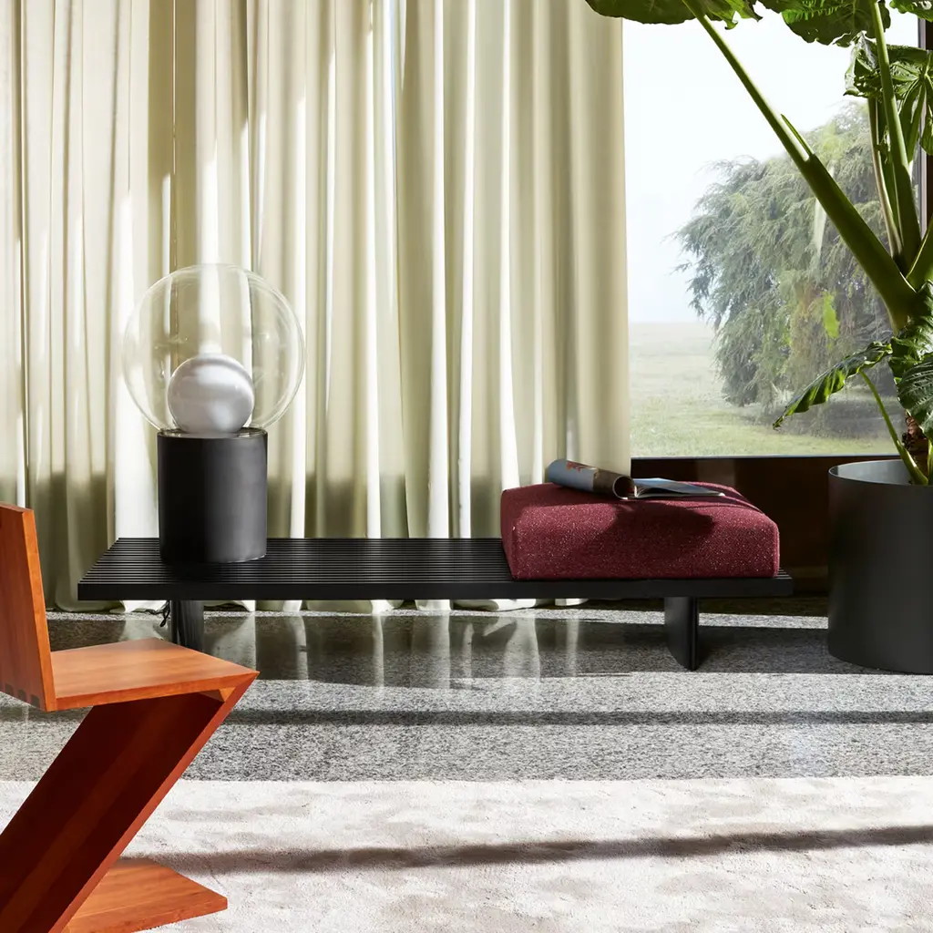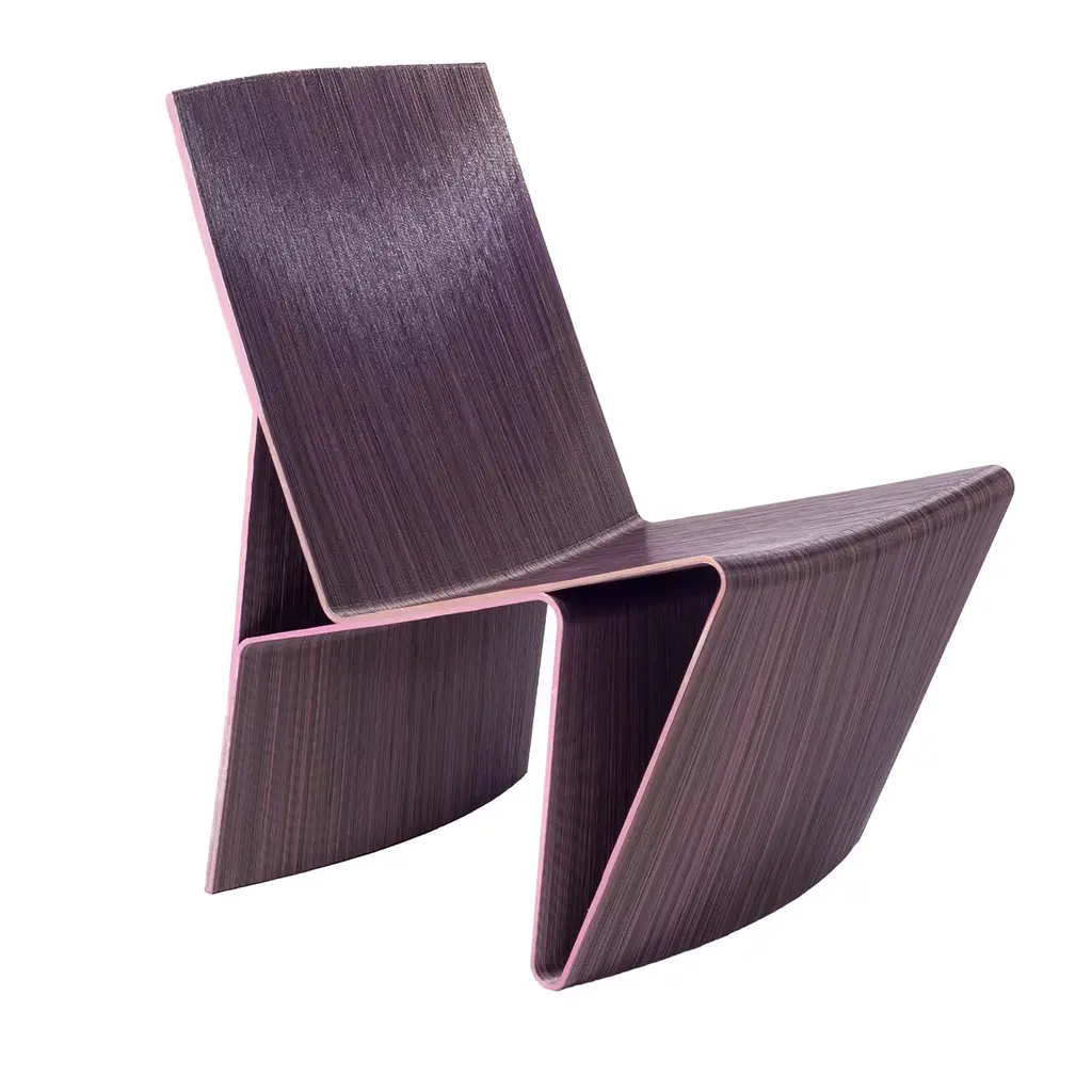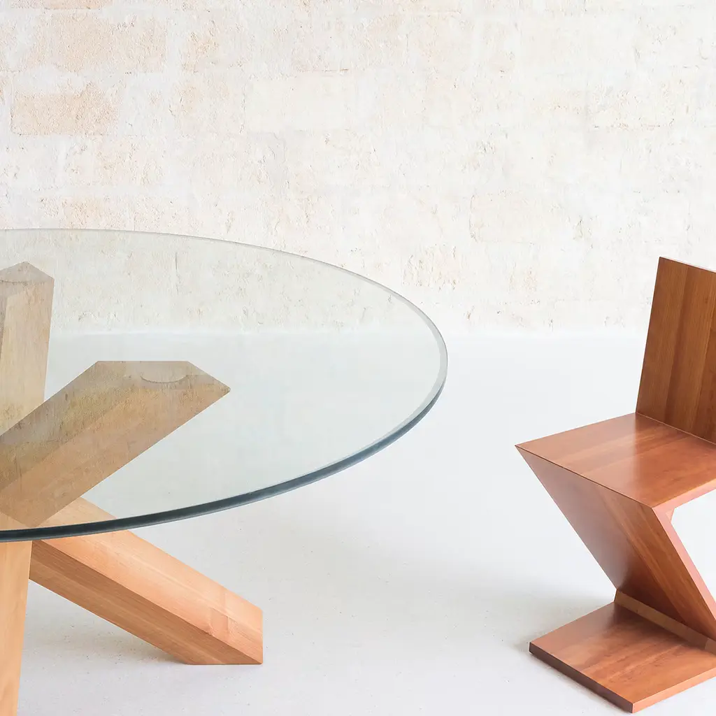 Zig Zag - Chair in natural cherrywood. Designed by Gerrit Rietveld, this chair provided an early example of a cantilevered seat, and is composed of four wood boards articulated end-to-end to form an extremely eye-catching example of an unstable structure. Eschewing the traditional legs-seat-back sequence, Rietveld created a ribbon of wood forming a Z-shape. The crafts mastery of Cassina’s carpenters is seen in the execution of the dove-tail joints, which add to the beauty of the piece. The aesthetic uniqueness of this piece can be seen particularly well in the coloured version, its open-pore finish highlighting the veins of the wood on the front and sides. This finish reflects a number of variations on the theme made by Rietveld, designed to highlight the relationship between the vertical, oblique and horizontal lines.