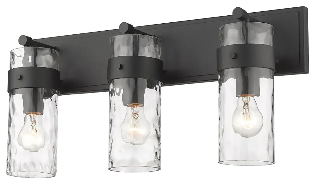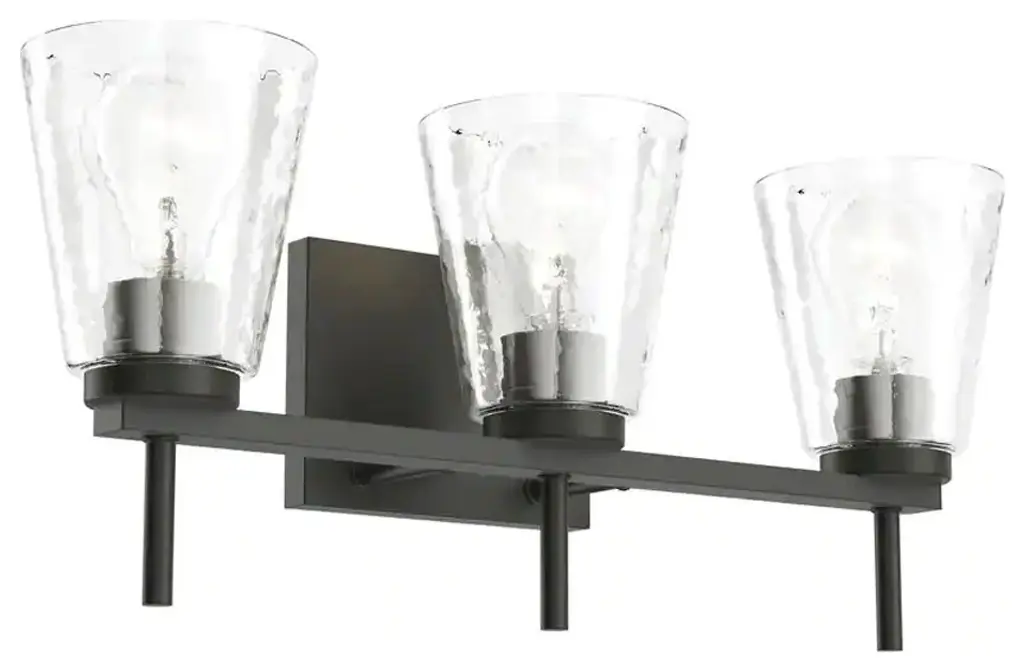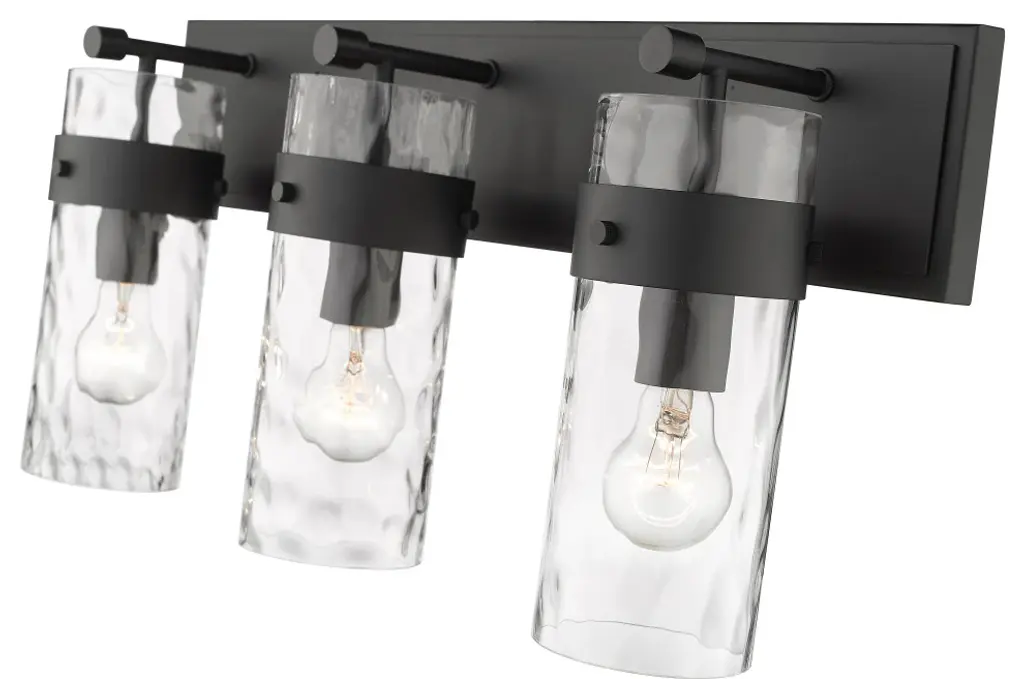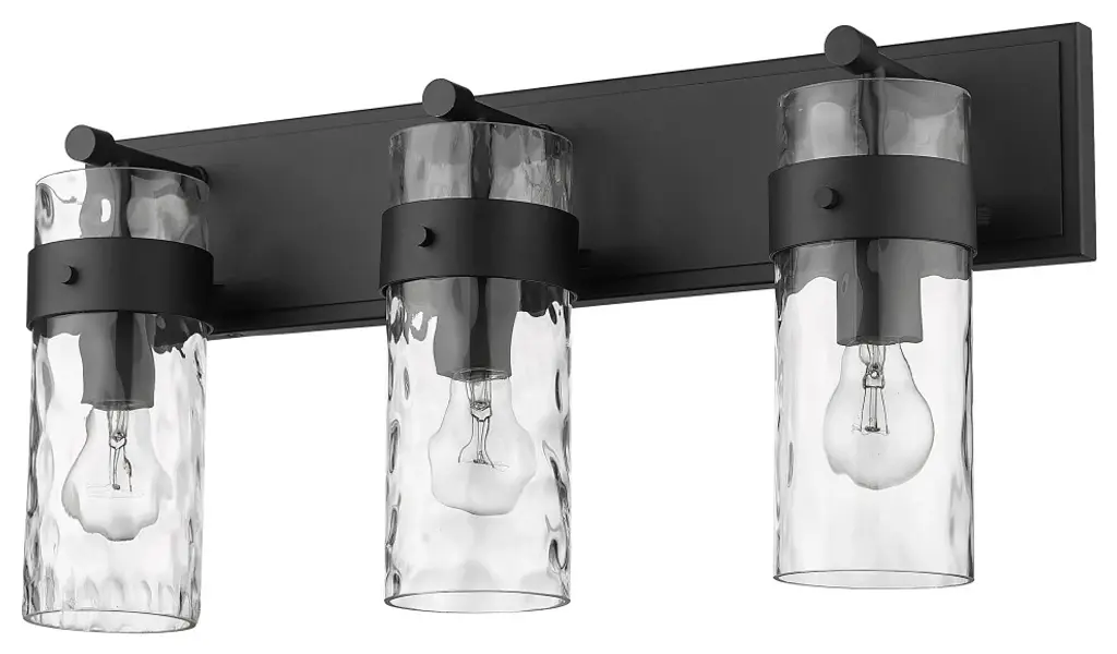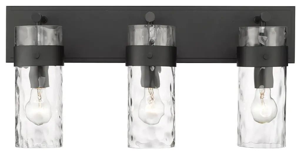 Understated elegance is the foundation of the Fontaine Collection with its bold jewelry cuff banding and thick waterglass shades with rich waves that softly diffuse the light. Available as vanity lights, pendants, and wall sconces, Fontaine fixtures take on a different style persona depending on the size and finish selected. Several sizes are offered, along with a rich array of finishes in Matte Black, Rubbed Brass, Brushed Nickel, and Polished Nickel.Equal parts stylish and functional, this three-light vanity fixture alluring. The cylindrical glass shade is accented with a ripple texture in a romantic design. Steel construction in a brushed nickel finish allows it to pair with many types of decor ranging from farmhouse to modern.Style : Transitional, traditional, coastal, modern, restorationBulbs Included : NoENERGY STAR : NoUL CLASSIFICATION : CUL/cETLuUL APPLICATION : DampActual Length/ext : 6"Frame Finish : Matte BlackFrame Material : SteelShade Finish/Color : ClearShade Material : GlassBulb Wattage : 100Number of Bulbs : 3Bulb Base : MediumDimmable (Yes/No) : YesActual Width : 24"Actual Height : 11.25"Backplate Dimensions : 24"L x 4.75"WActual Weight : 10 lbs