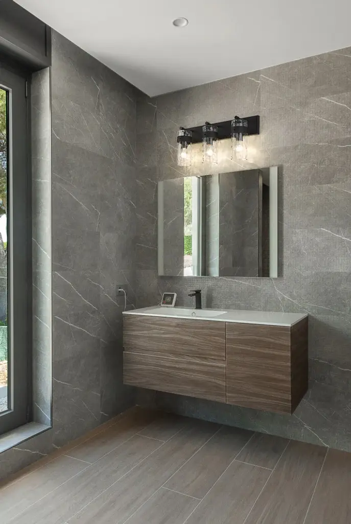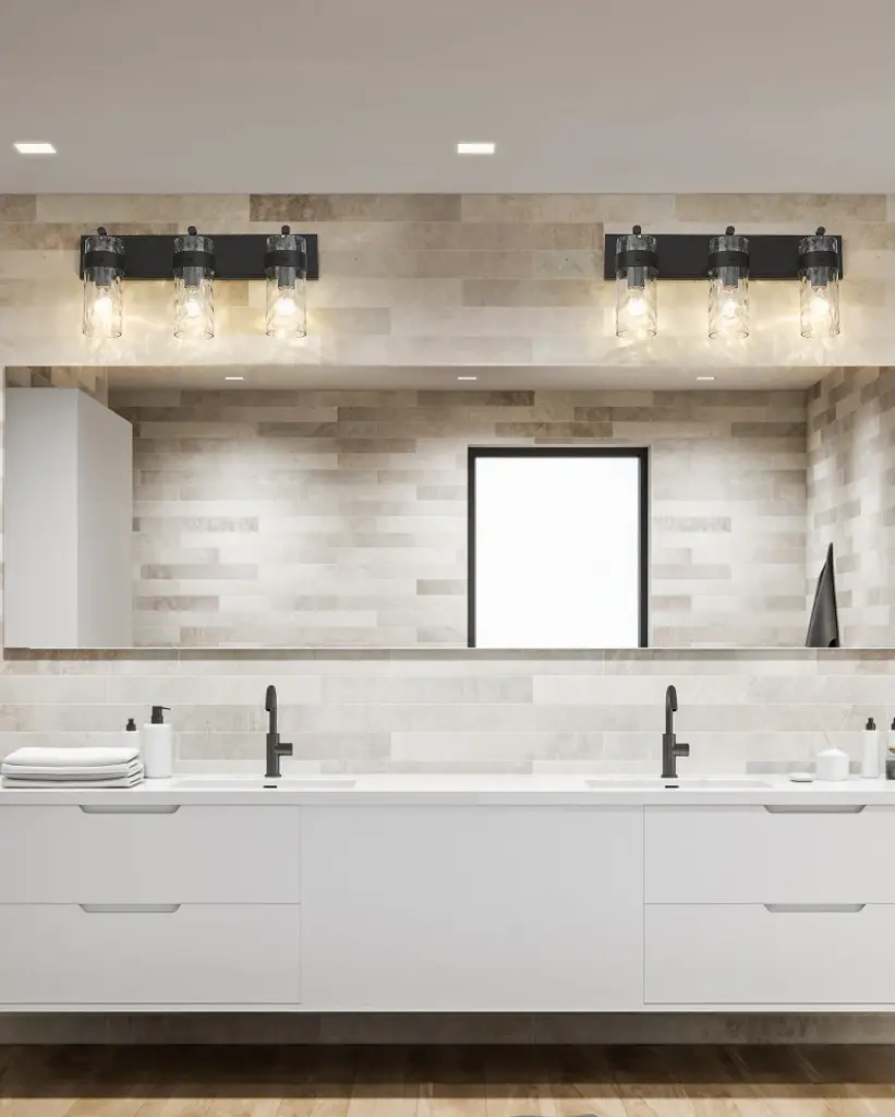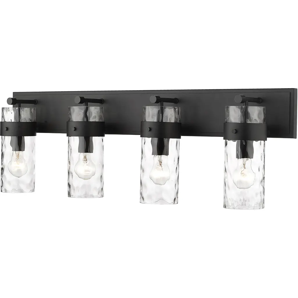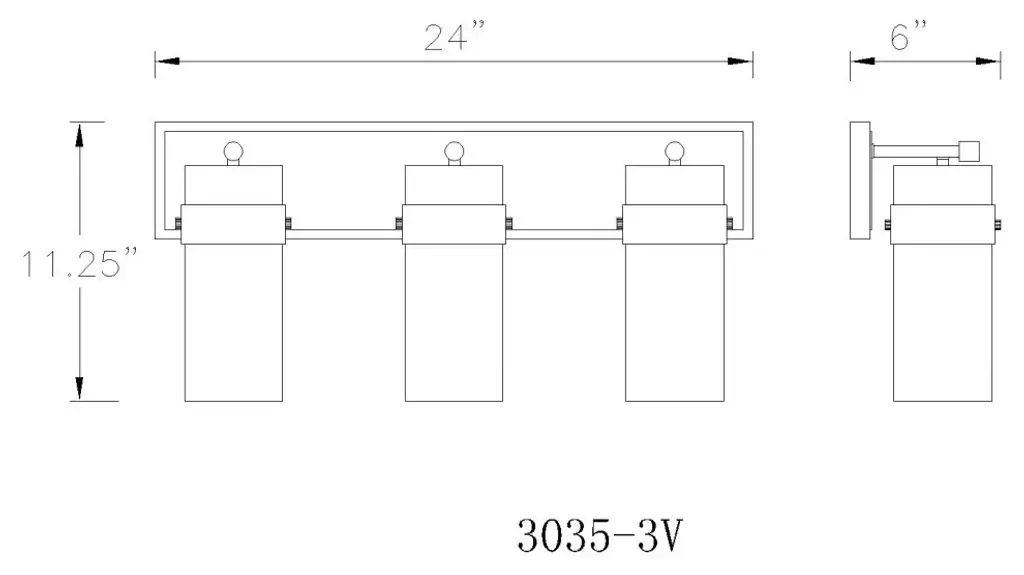 Understated elegance is the foundation of the Fontaine Collection with its bold jewelry cuff banding and thick waterglass shades with rich waves that softly diffuse the light. Available as vanity lights, pendants, and wall sconces, Fontaine fixtures take on a different style persona depending on the size and finish selected. Several sizes are offered, along with a rich array of finishes in Matte Black, Rubbed Brass, Brushed Nickel, and Polished Nickel.Equal parts stylish and functional, this three-light vanity fixture alluring. The cylindrical glass shade is accented with a ripple texture in a romantic design. Steel construction in a brushed nickel finish allows it to pair with many types of decor ranging from farmhouse to modern.Style : Transitional, traditional, coastal, modern, restorationBulbs Included : NoENERGY STAR : NoUL CLASSIFICATION : CUL/cETLuUL APPLICATION : DampActual Length/ext : 6"Frame Finish : Matte BlackFrame Material : SteelShade Finish/Color : ClearShade Material : GlassBulb Wattage : 100Number of Bulbs : 3Bulb Base : MediumDimmable (Yes/No) : YesActual Width : 24"Actual Height : 11.25"Backplate Dimensions : 24"L x 4.75"WActual Weight : 10 lbs
