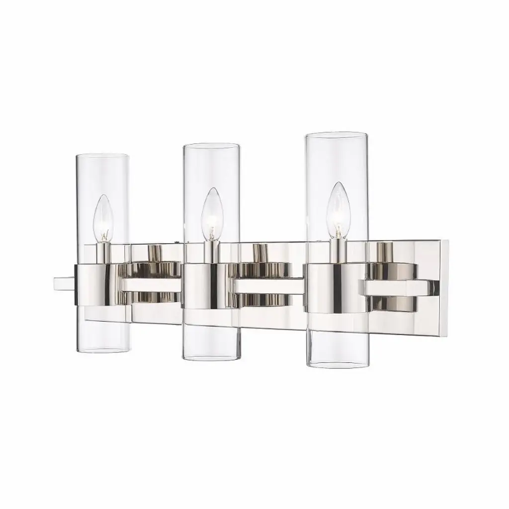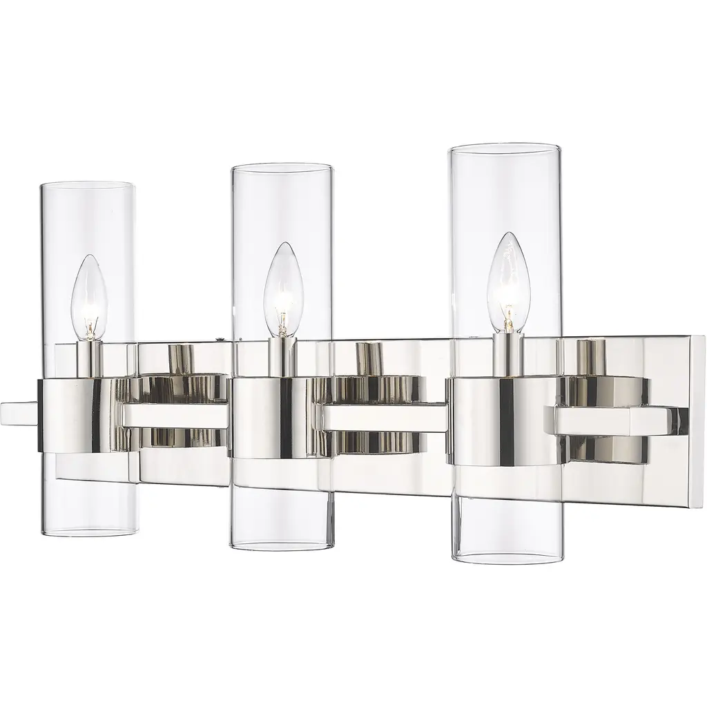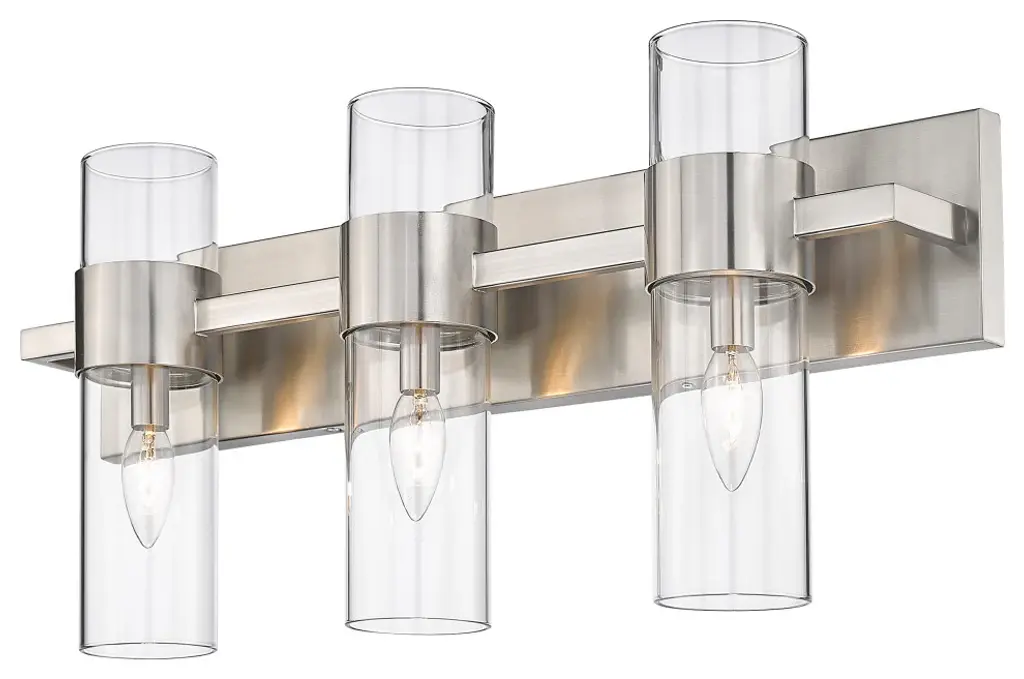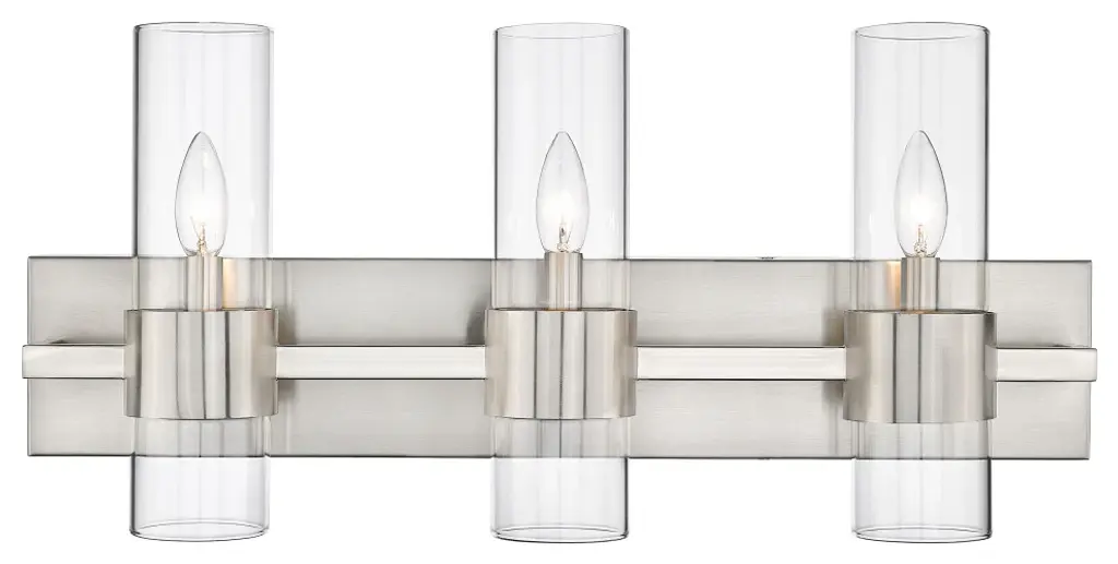 With jewelry-like cuffs clasping the transparent glass cylinders surrounding the light source, the Lawson series balances its boldness with the slender aesthetic of the glass to create a timeless look that can suit a variety of design environments. Available in Rubbed Brass, Polished Nickel, Brushed Nickel, and Matte Black finishesMinimalist modern style carries through in this chic linear contemporary vanity light, transforming en suite bathrooms and spacious powder room into a sleek and restful retreat. An elongated steel plate suspends three lantern-like clear glass cylinder shades, each held in place by a wide brushed nickel ring that adds a luxe metallic touch. Mirror existing bathroom hardware and fixtures and create substantial illumination with this three-light vanity light, mounting it above a decorative bathroom mirror over a countertop or dressing area.Style : Modern, transitional, sleek, linear, retro restoration, contemporaryBulbs Included : NoENERGY STAR : NoUL CLASSIFICATION : CUL/cETLuUL APPLICATION : DampActual Length/ext : 4.75"Frame Finish : Brushed NickelFrame Material : SteelShade Finish/Color : ClearShade Material : GlassBulb Wattage : 60Number of Bulbs : 3Bulb Base : CandelabraDimmable (Yes/No) : YesActual Width : 25"Actual Height : 11"Backplate Dimensions : 25" W x 4.7" HActual Weight : 9 lbs