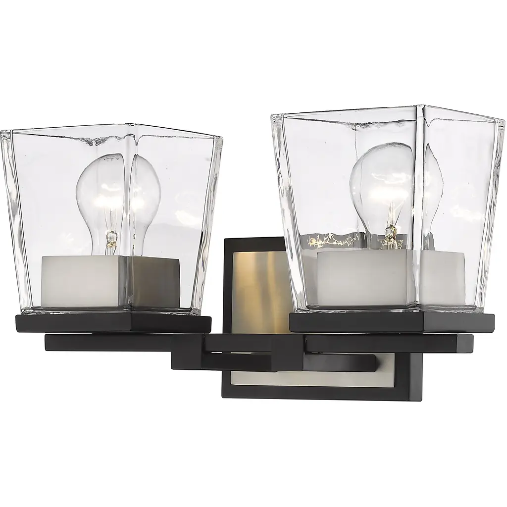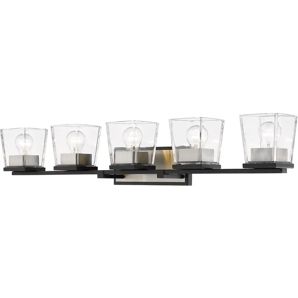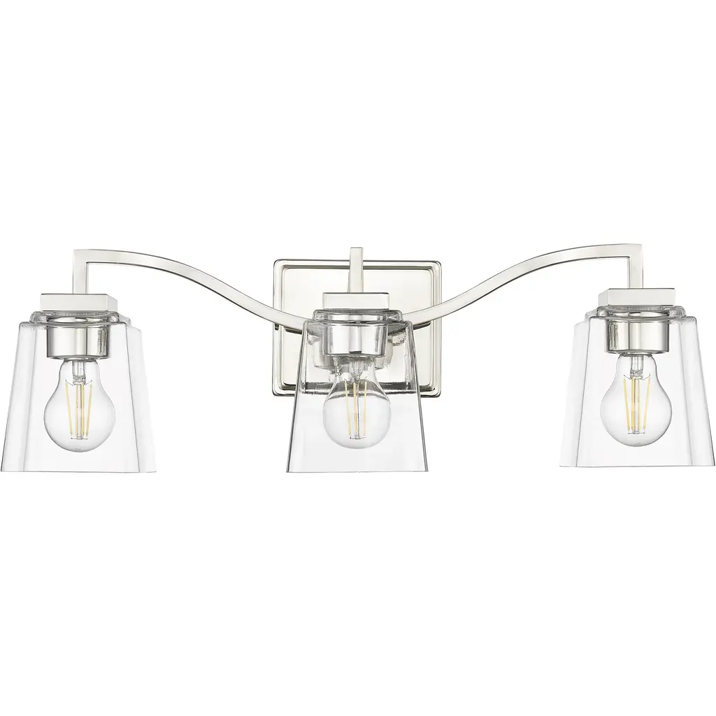 Bleeker Streets stylish design complements a variety of decors with its sleek lines and bold glass shape. The accent back plate and the square base luminaire holder add to its beauty. Available in three combined finishes, Matte Black + Brushed Nickel, Matte Black + Chrome, or Matte Black + Olde Brass.With a sleek cosmopolitan attitude and a beautiful blend of glass and metal, this three-light vanity offers a sophisticated way to stylize a contemporary compact bath space. Matte Black and Brushed Nickel serve as stunning finishes for a tasteful fixture delivering a geometric silhouette that flatters custom vanities.Style : Transitional, Craftsman, Industrial, Restoration, ModernBulbs Included : NoUL CLASSIFICATION : CUL/cETLuUL APPLICATION : DampActual Length/ext : 6.5"Frame Finish : Matte Black + Brushed NickelFrame Material : SteelShade Finish/Color : ClearShade Material : GlassBulb Wattage : 100Number of Bulbs : 3Bulb Base : MediumDimmable (Yes/No) : YesActual Width : 25"Actual Height : 7.5"Backplate Dimensions : 9"L x 4.75"WActual Weight : 10 lbs