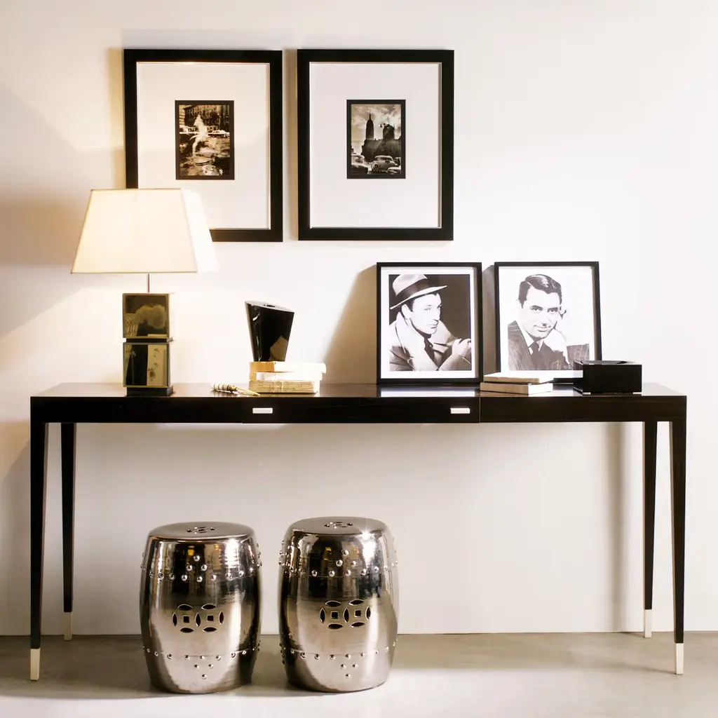 Rigorous geometry and a light silhouette create the sophisticated design of this superb console. The timeless quality of this piece makes it an ideal addition to both a classic and a modern interior. Its structure is in prized Macassar ebony with accents in metal that were colored in ivory, adding a delicate touch to the tips of the slender and tapered legs and the handles of the single drawer. The piece also comes with a top in shagreen.