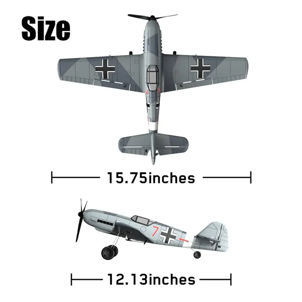 The warbird BF109 RC Airplane adopts flight control stabilization design, and the stabilization mode is defined as gyroscope flight control automatic balance mode + automatic fine-tuning attitude perception balance.For example, if the aircraft cannot maintain a stable flight after being balanced by the flight control, then the automatic fine-tuning will be performed to achieve the the best flying attitude, so that there is no need to manually adjust the fine-tuning.Therefore, the test of this mode on the ground will be different from the normal flight control balance mode on the market, because the main processing needs to monitor the attitude in real time and make fine adjustments, so you will see that the servo cannot automatically restore the balance!Description:Brand: ZOHDModel: BF109 V2Version: BNF, RTF (optional)Wingspan: 400mm (15.75 inches)Length: 317mm (12.48 inches)Flying weight: 0.1lbsMaterial: EPPMotor: 1020 Coreless MotorBattery: 3.7V 400mah 20CCharger: USB cableRemote control: 2.4GHz 4CHRemote control distance: more than 200 metersExperience level: BeginnersWhere to play: OutdoorIs Assembly required: NoFlight time: 15minsPackage included:1 x?ZOHD BF109 V2 2.4GHz 4CH 400mm Wingspan 6-Axis EPP Mini RC Airplane Camouflage gray BNF with 2 BatteriesNote: BNF Version doesn't included transmitter.