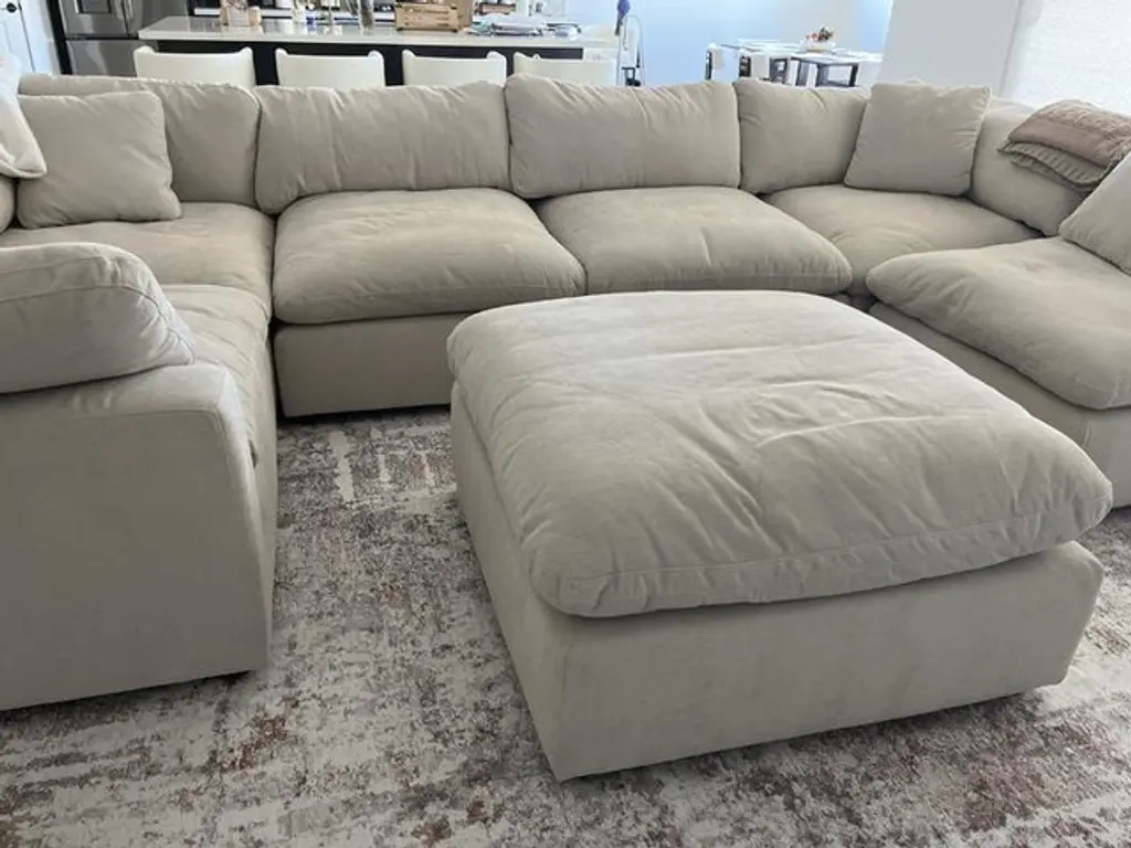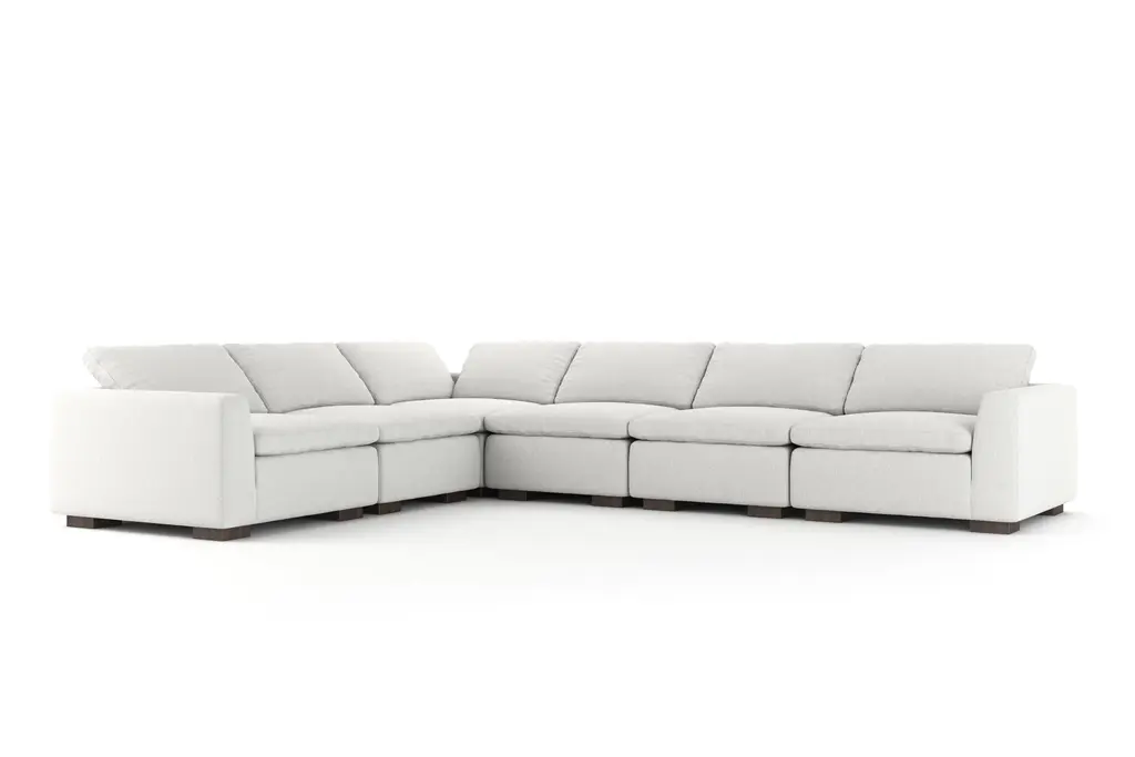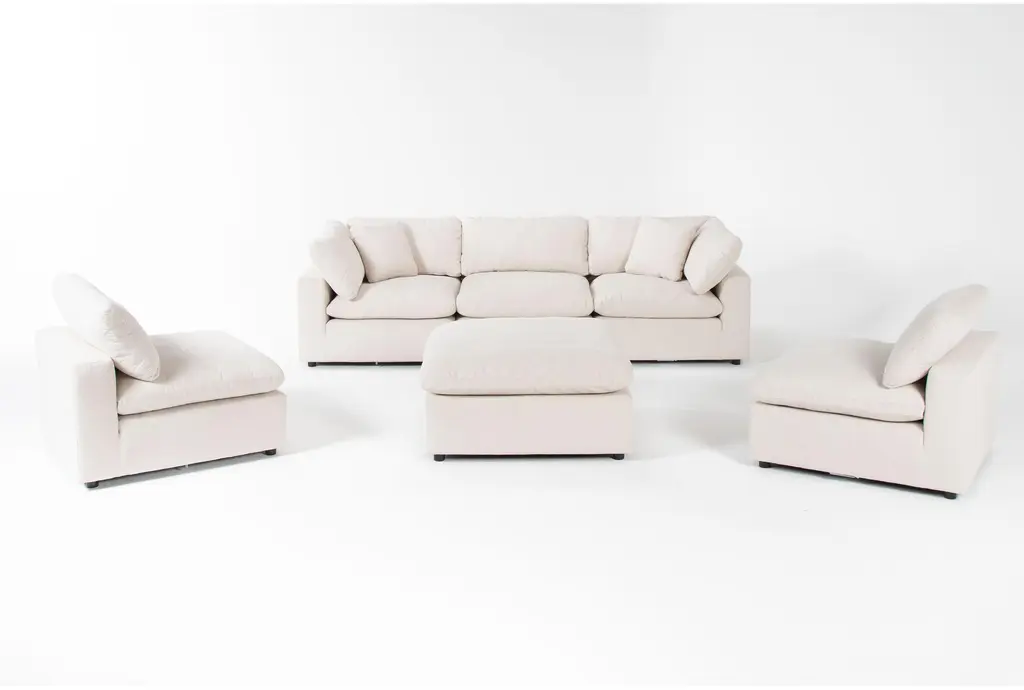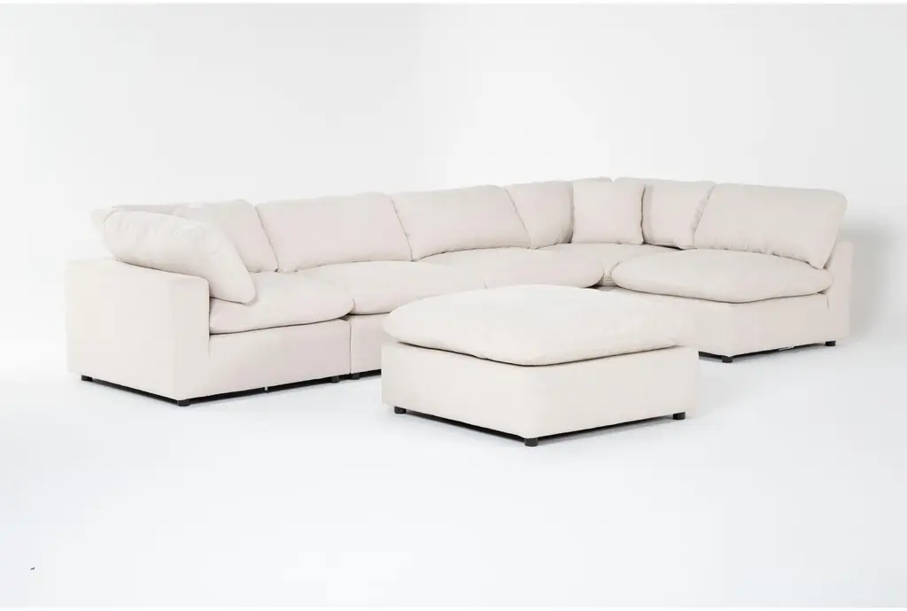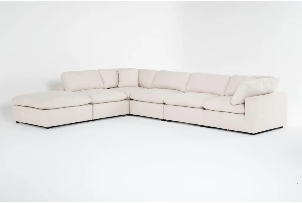 Experience the ultimate in comfort and versatility with the Zone Cream White Fabric 124" 6 Piece Modular L-Shaped Sectional. This sectional includes 2 corners, 3 armless chairs, and an ottoman, all designed to provide a cloud-like seating experience. Its reversible orientation allows you to easily adapt the layout to suit your living space.