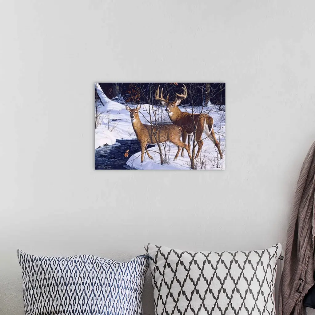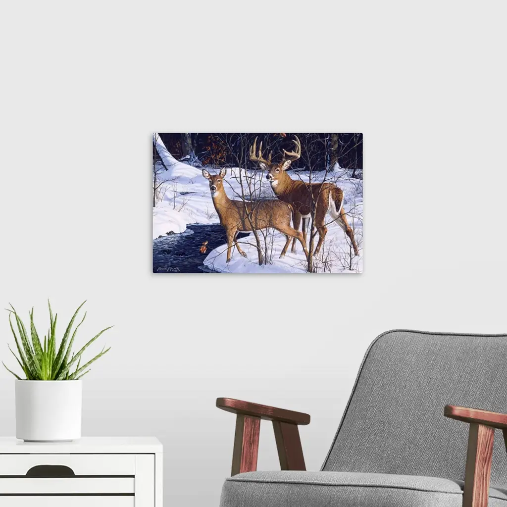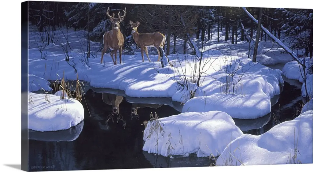 A buck and a doe standing alert by a stream deer.