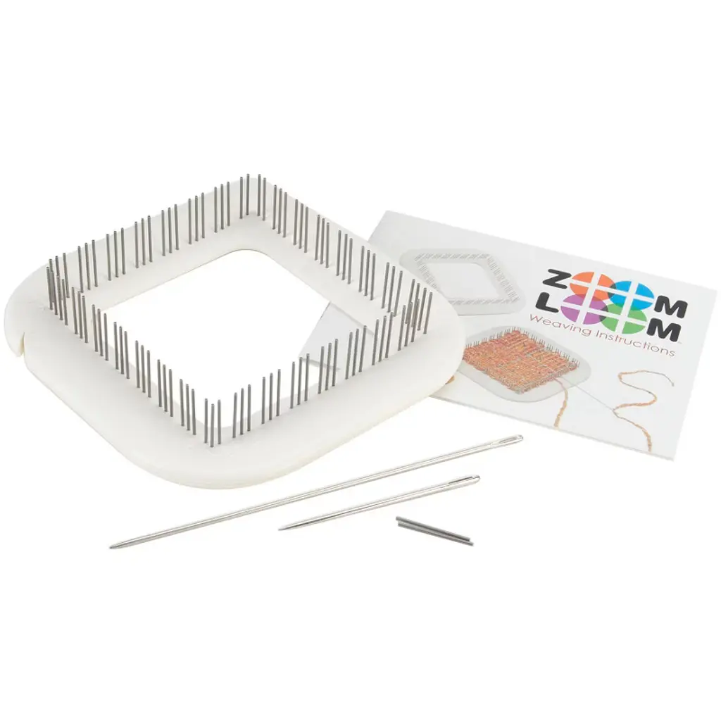 The Zoom Loom is a pin loom with a difference. If you've ever woven on a pin loom, you'll love this new and improved model. The loom features a sloping interior edge that effortlessly guides your weaving needle, has graceful extended sides that are very comfortable to hold, instructions are molded-in on the front and back, has handy slots that hold the beginning yarn without knotting, and is small and compact. This package contains one 4x4 inch plastic and metal loom, one 6 inch weaving needle, one 3 inch tapestry needle, and an instruction booklet with three patterns. Made in USA.