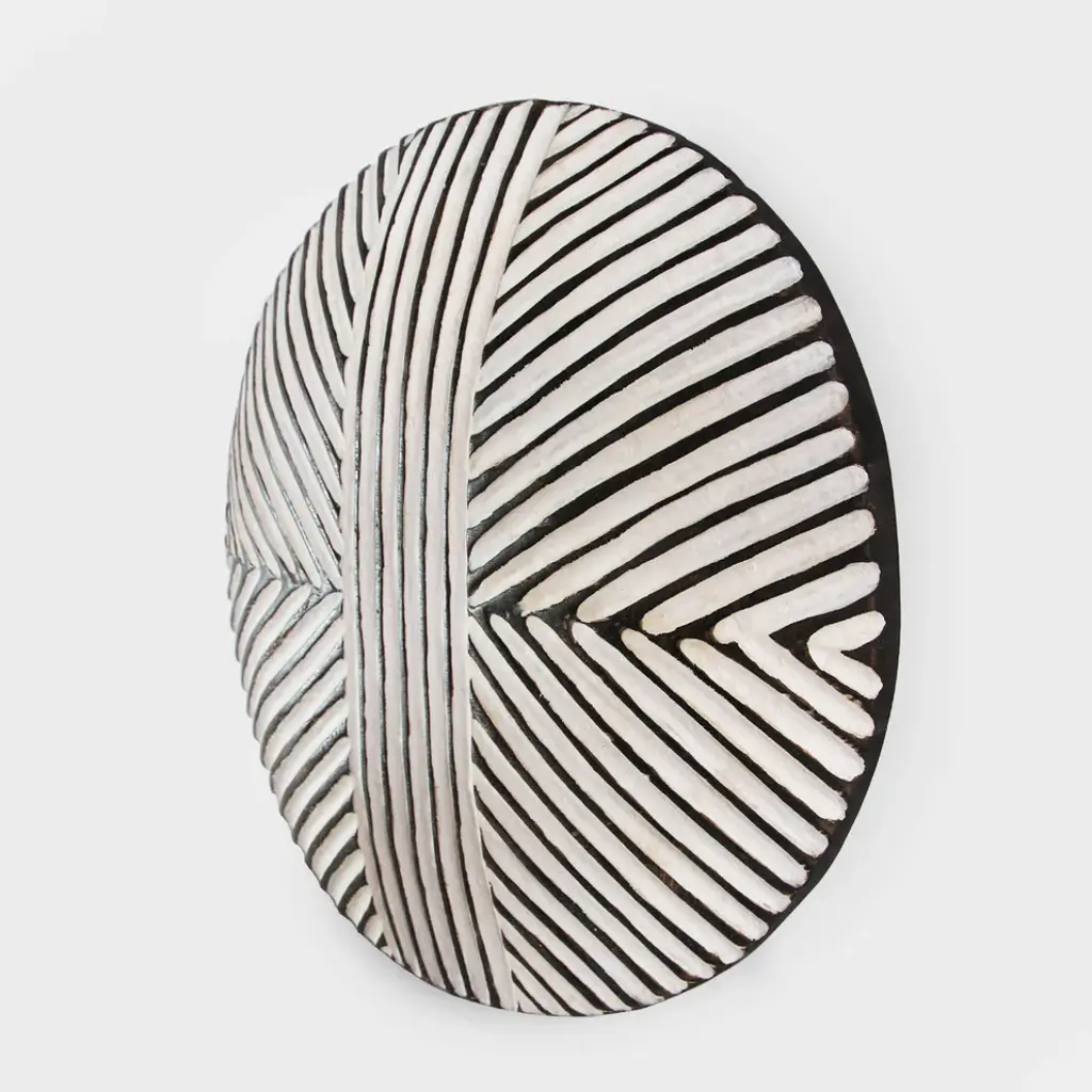 Traditional South African Zulu shields date back to King Shaka Zulu and have been used by tribesman in battle for hundred of years. As the modern world has evolved so to has the Zulu tribesman. These shields are no longer used in battle but instead used for traditional Zulu ceremonies such as weddings in telling historic ancestry stories. These carved wood designs painted in bold black and white patterns continue to have a striking modern form displayed in groupings. Each may vary slightly due to unique hand carvings. Comes with hook attached on back for hanging on wall. This item is non-returnable - all sales are final.