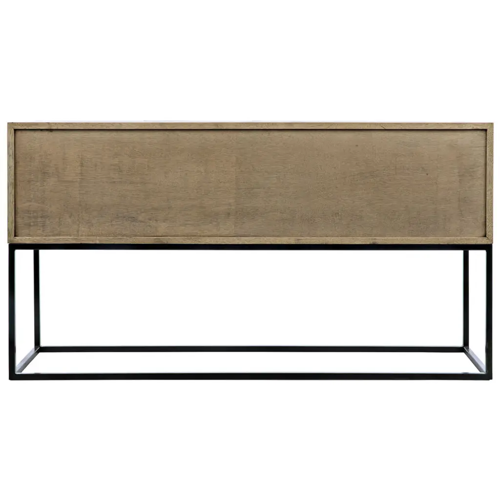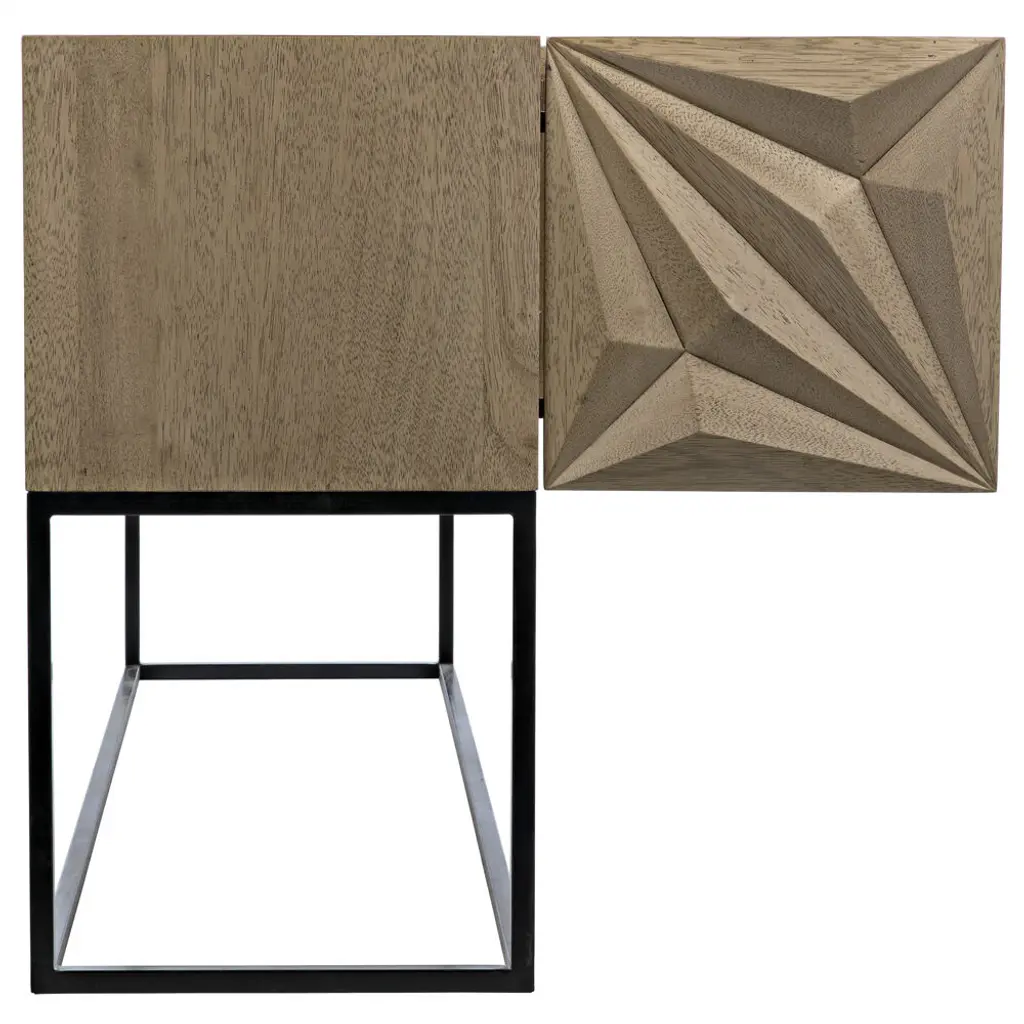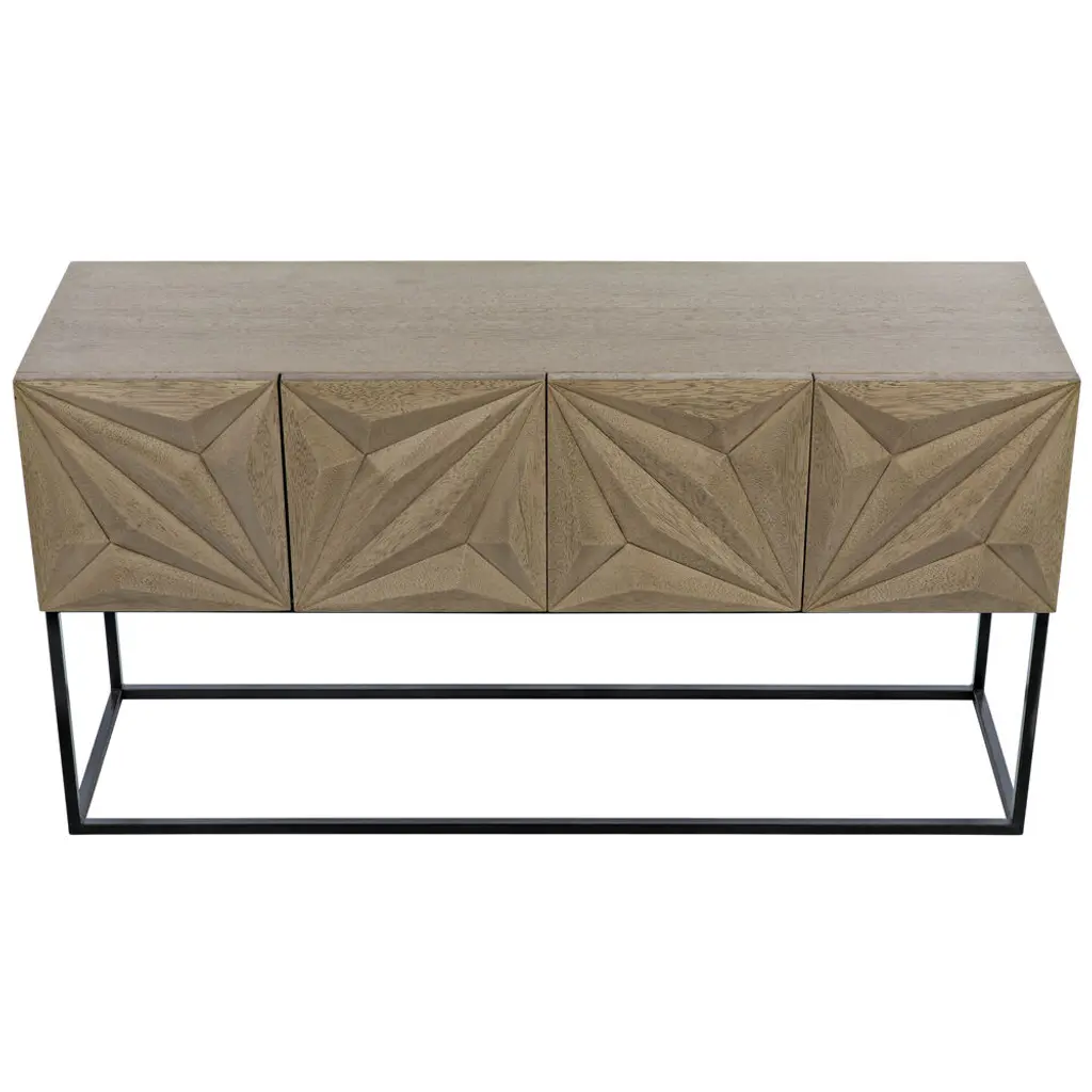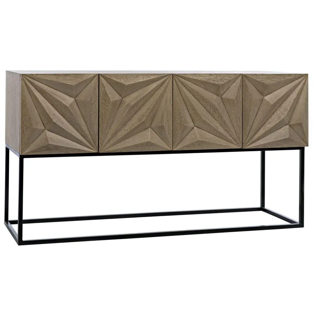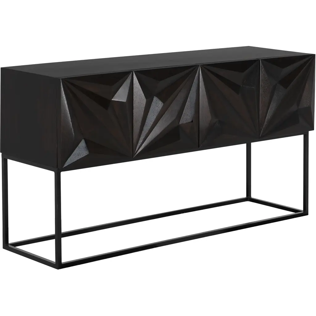Stunning in its simplicity, this solid walnut sideboard rests atop slim metal legs. Each of its four doors is beautifully hand-carved with bold diamond and rhombus patterns. Open, they reveal generous interior storage. Simplicity, perfectly rendered.