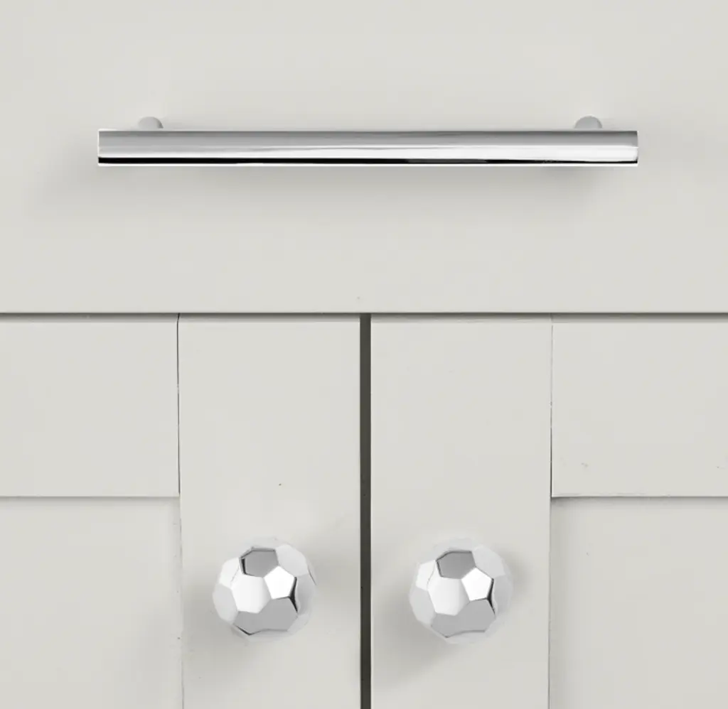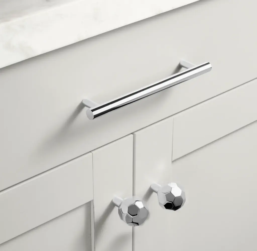 Durham hardware from designer Jonathan Browning highlights the geometry of the faceted sphere. The pure form of the knobs translates into 12 bevels on the pulls. Each of the planes catches the light for a lustrous sparkle.
