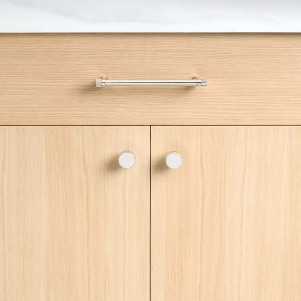 Sometimes it's the small things that pull a room together. That's why we've designed a hardware collection with modern silhouettes, clean lines and a touch of tradition to give your kitchen or bath that perfect finishing touch. Made of brass finished in shiny chrome, the drawer pull lends industrial chic to its minimalist design. Fluted ends bring texture to the round pull that's held in place by L-shaped anchors softened with rounded edges. The three-inch drawer pull easily fastens to drawers and doors with included hardware.