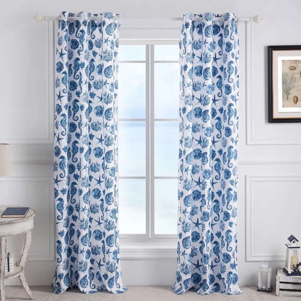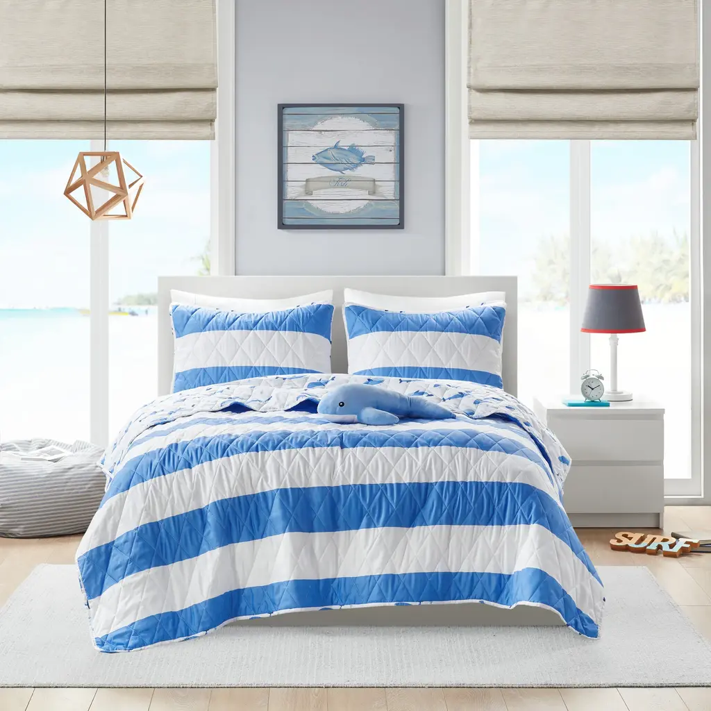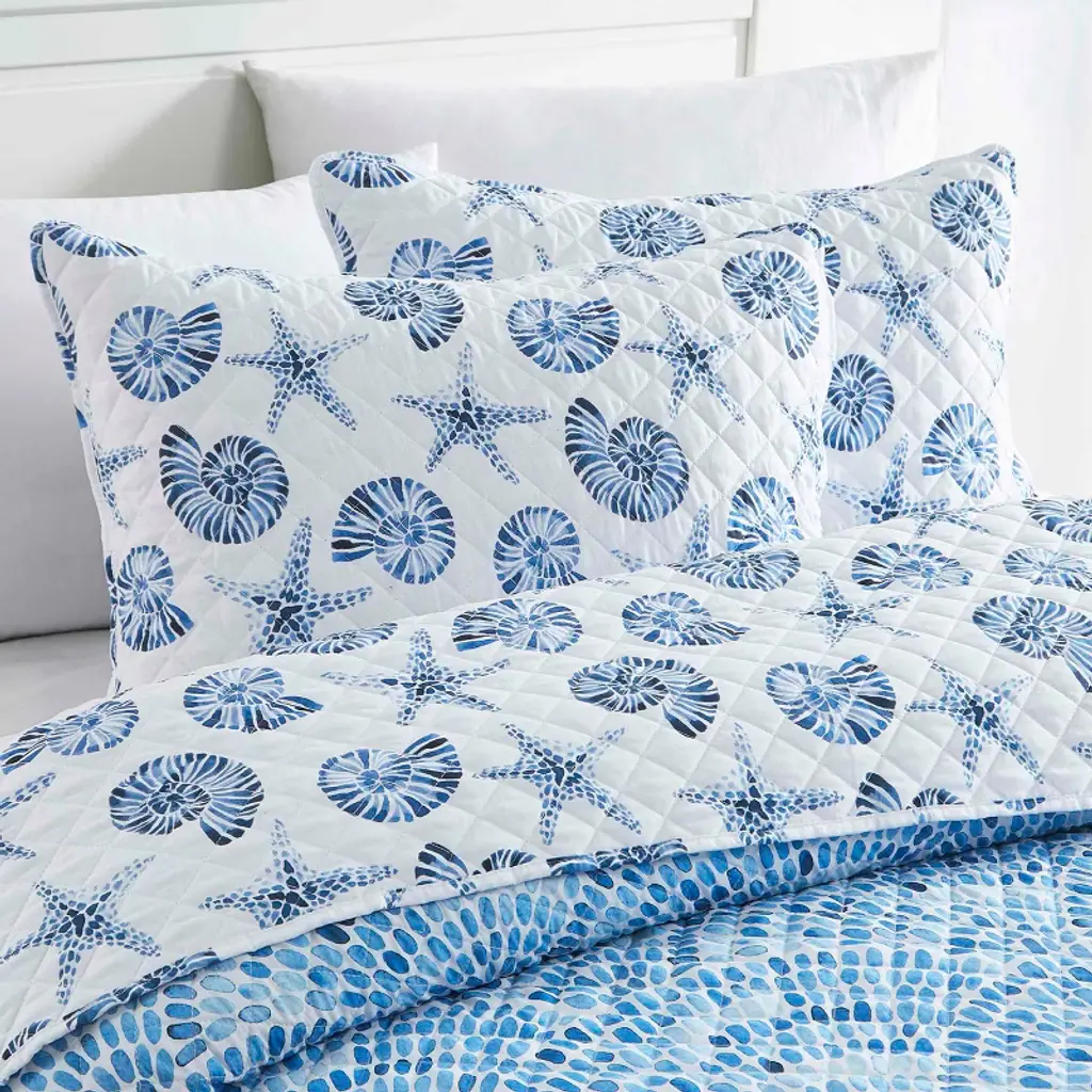 The Avanti Veracruz Twin Quilt Set features an overlapping semi-circular mosaic design on the face, reversing to nautilus and starfish on a white ground, all in shades of blue. Printed on supersoft 100% microfiber with polyester fiber filling. Set includes one 70" x 90" quilt and one 20" x 26" sham with the nautilus and shell design.