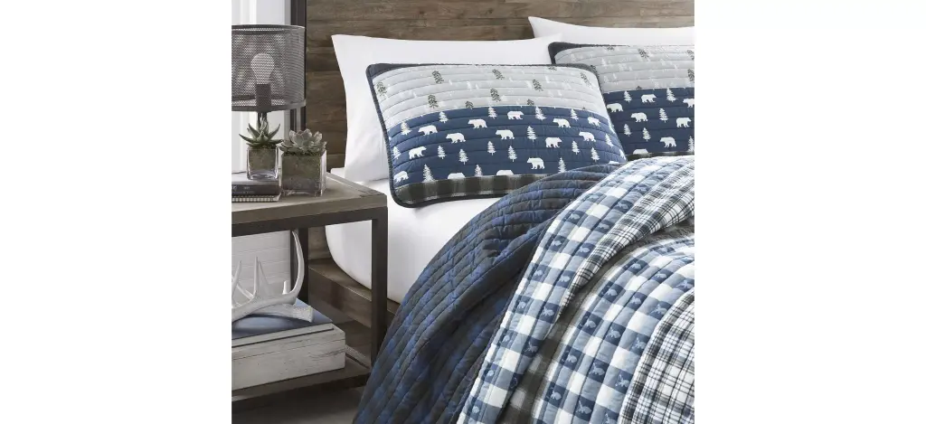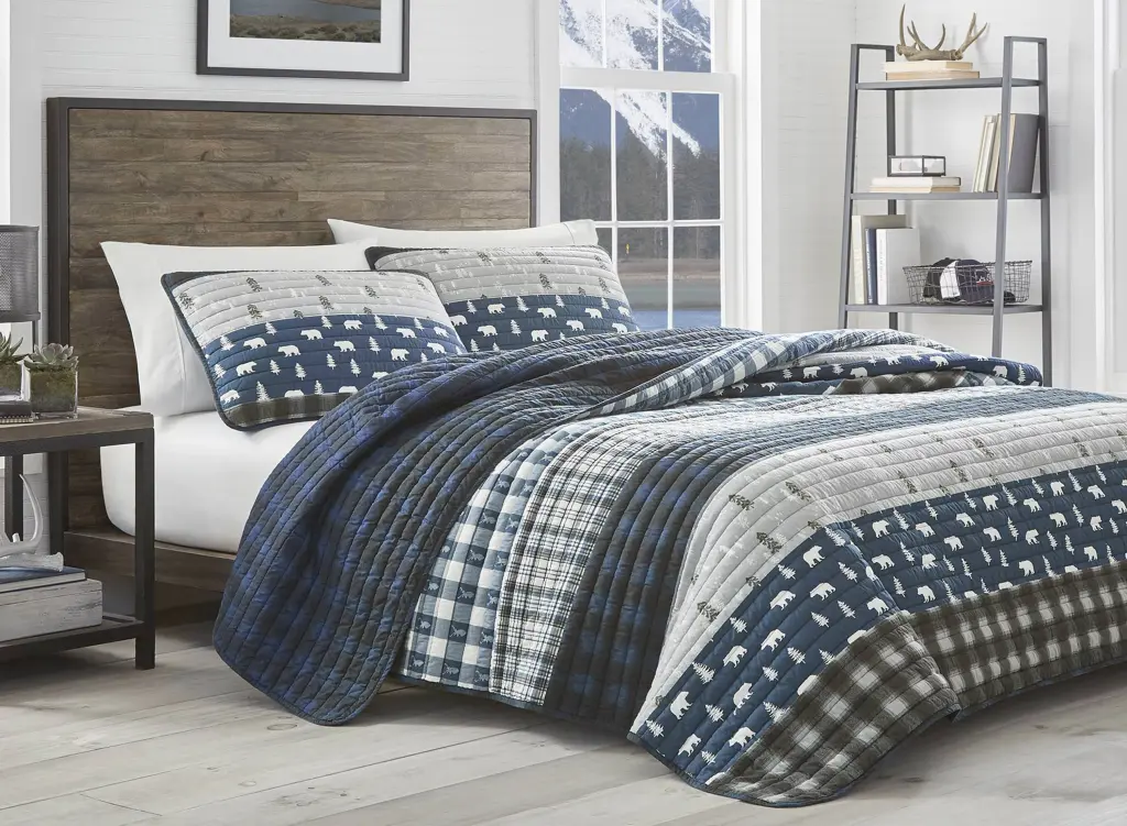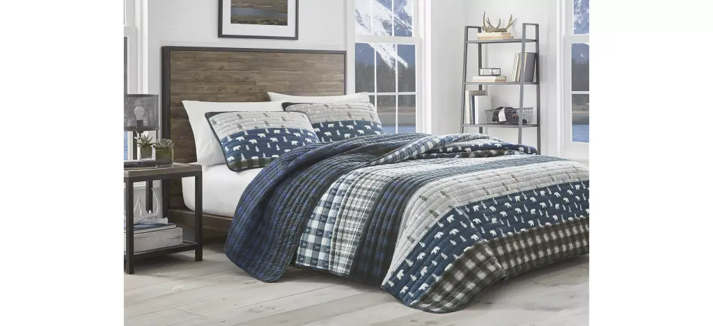 The Blue Creek Plaid 3-pc. Quilt Set is a very popular design. Each patch features iconic motifs, in hues of blues, grays and charcoal. Reverses to a blue and charcoal buffalo check. Made from 100% cotton and pre-washed, the quilt set is breathable, durable and soft. Filled with a blend of 80% cotton and 20% polyester, the quilt is lightweight but warm. Two shams are included to round out the ensemble. Rounded corners and unique channel quilt stitch are the details you'd expect from Eddie Bauer. Packaged thoughtfully without plastic. Machine washable for easy care.