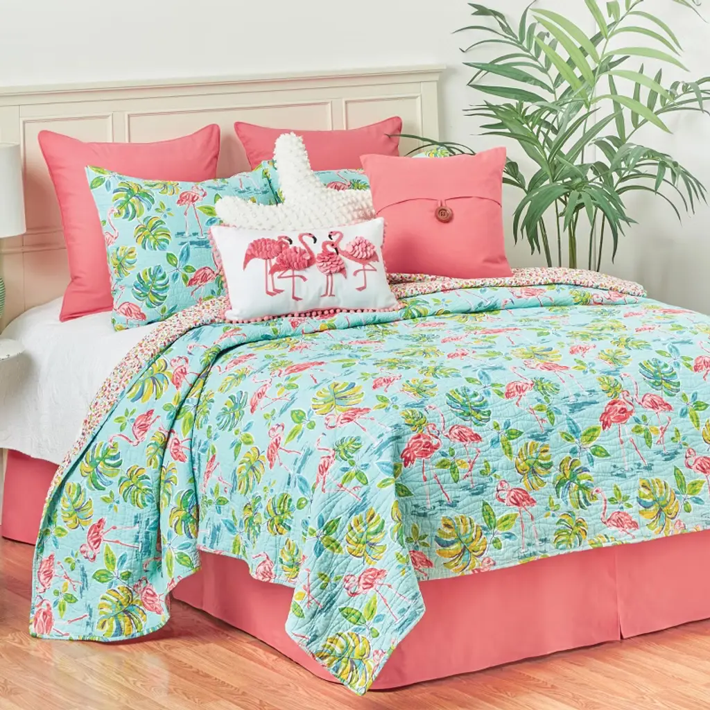 Transform your bedroom into a tropical paradise with the Flamingo Garden quilt set. A bright and colorful design of painterly-style pink flamingos, green palms, and cool blue pools makes any day a vacation. Perfect for a coastal rental, a Caribbean-theme, or a whimsical summer bedroom this vibrant quilt is sure to bring color to you home. Flamingo Garden is quilted with undulating wave stitching and reverses to a dynamic confetti dots pattern for even more styling options. Pair with our coral euro shams and bed skirt for the finishing touches. Crafted of cotton and machine washable for easy care. Accent pillows, euro shams and bed skirt sold separately. Flamingo Garden is also available in a tabletop collection.