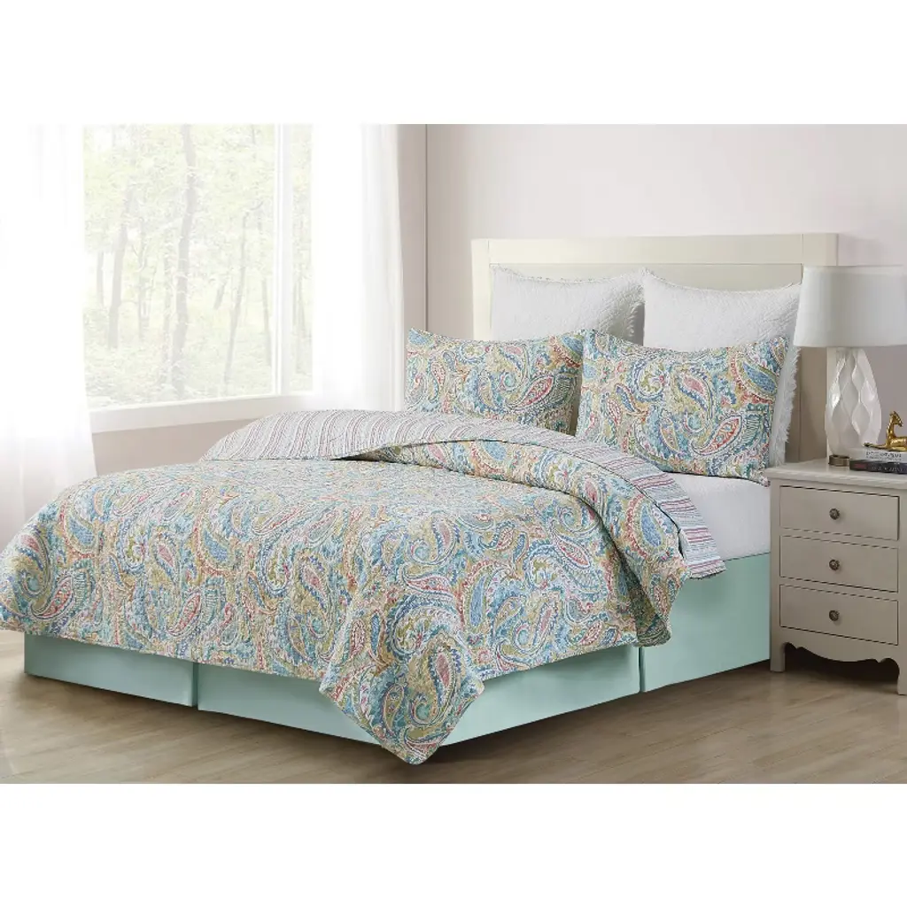 Displaying a large-scale paisley pattern in blues and mauve paisley motifs, the Maisie quilt set will freshen up your bedroom with a splash of color. Finished with a floral medallion stitching design and reversible to a coordinating striped pattern, the Maisie is easily accented with pops of surf, teal, and green decorative pillows. Crafted of cotton this quilt set is machine washable for easy care, sophisticated look. Crafted of cotton this quilt set is machine washable for easy care.