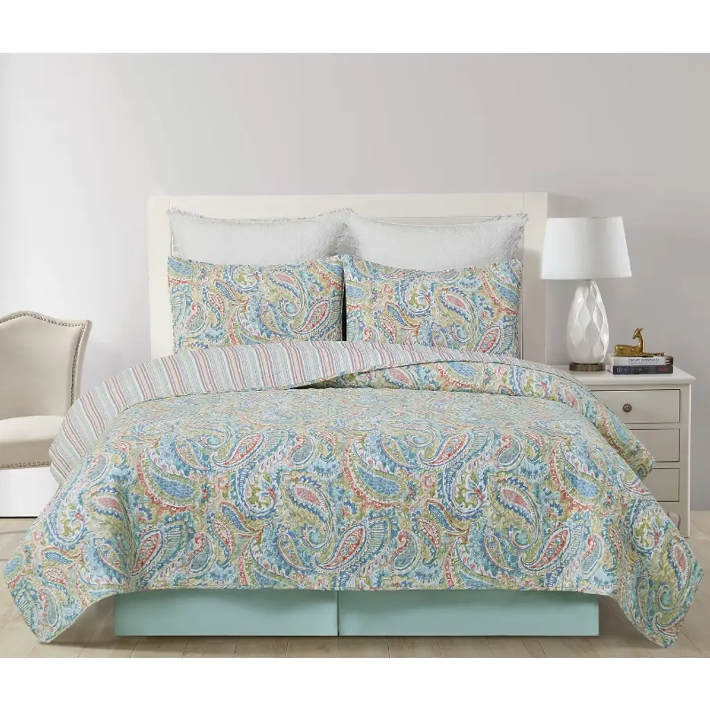 Displaying a large-scale paisley pattern in blues and mauve paisley motifs, the Maisie quilt set will freshen up your bedroom with a splash of color. Finished with a floral medallion stitching design and reversible to a coordinating striped pattern, the Maisie is easily accented with pops of surf, teal, and green decorative pillows. Crafted of cotton this quilt set is machine washable for easy care, sophisticated look. Crafted of cotton this quilt set is machine washable for easy care.