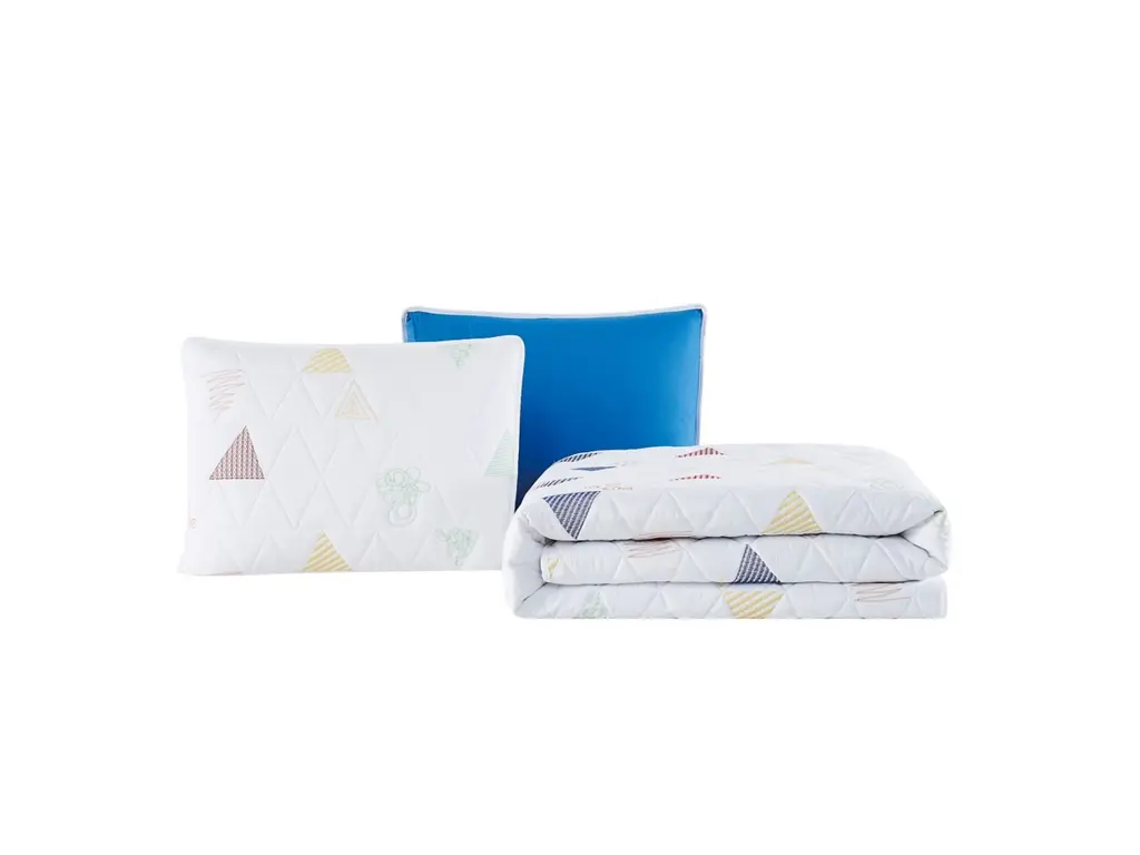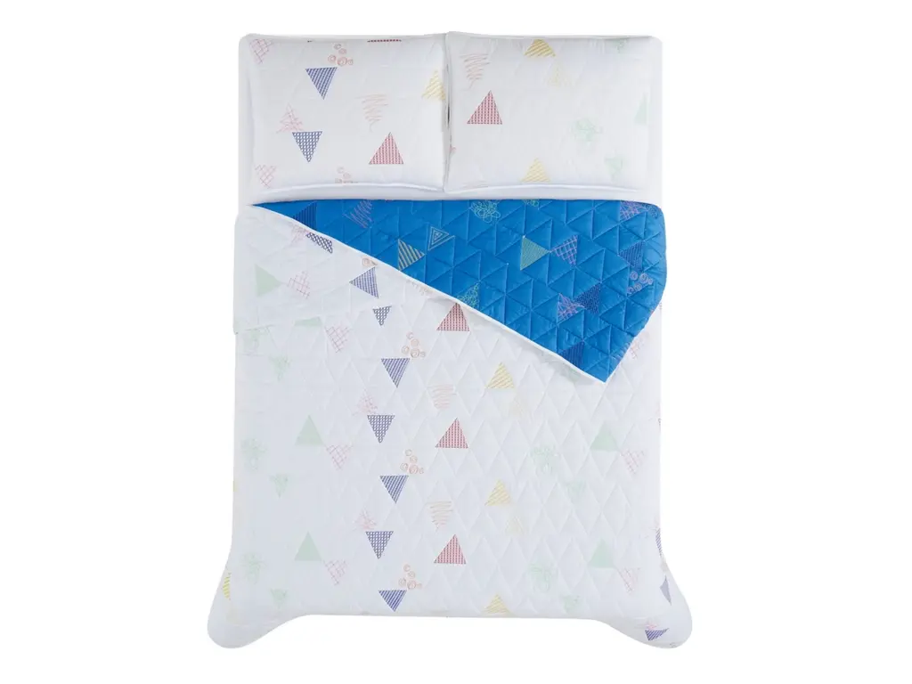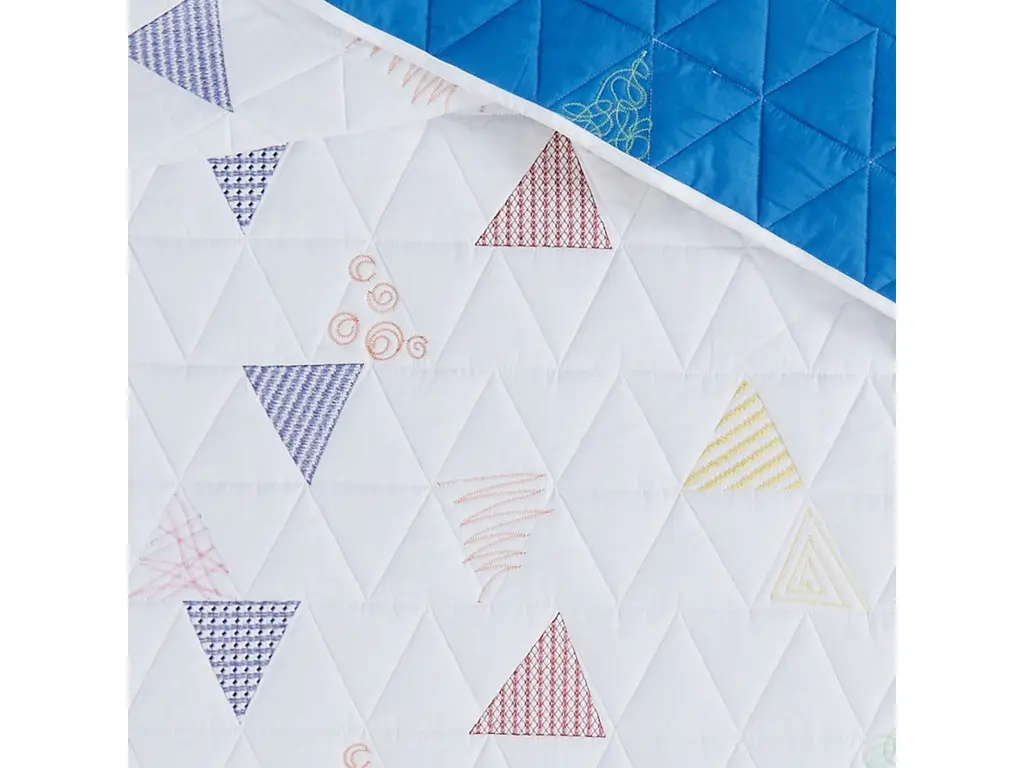 Incorporate imagination and style into your child's bedroom with this Triangle Embroidered Quilt Set by Crayola. The solid white background is accented by a textured quilted design and a vibrant blue reverse that encourages self-expression and creativity. This quilt has a fun abstract triangle pattern and comes with coordinating sham. The soft 100% cotton material is durable and the fabric construction allows for year-round use. Add to your colorful bedding ensemble with comforter and sheet sets by Crayola.