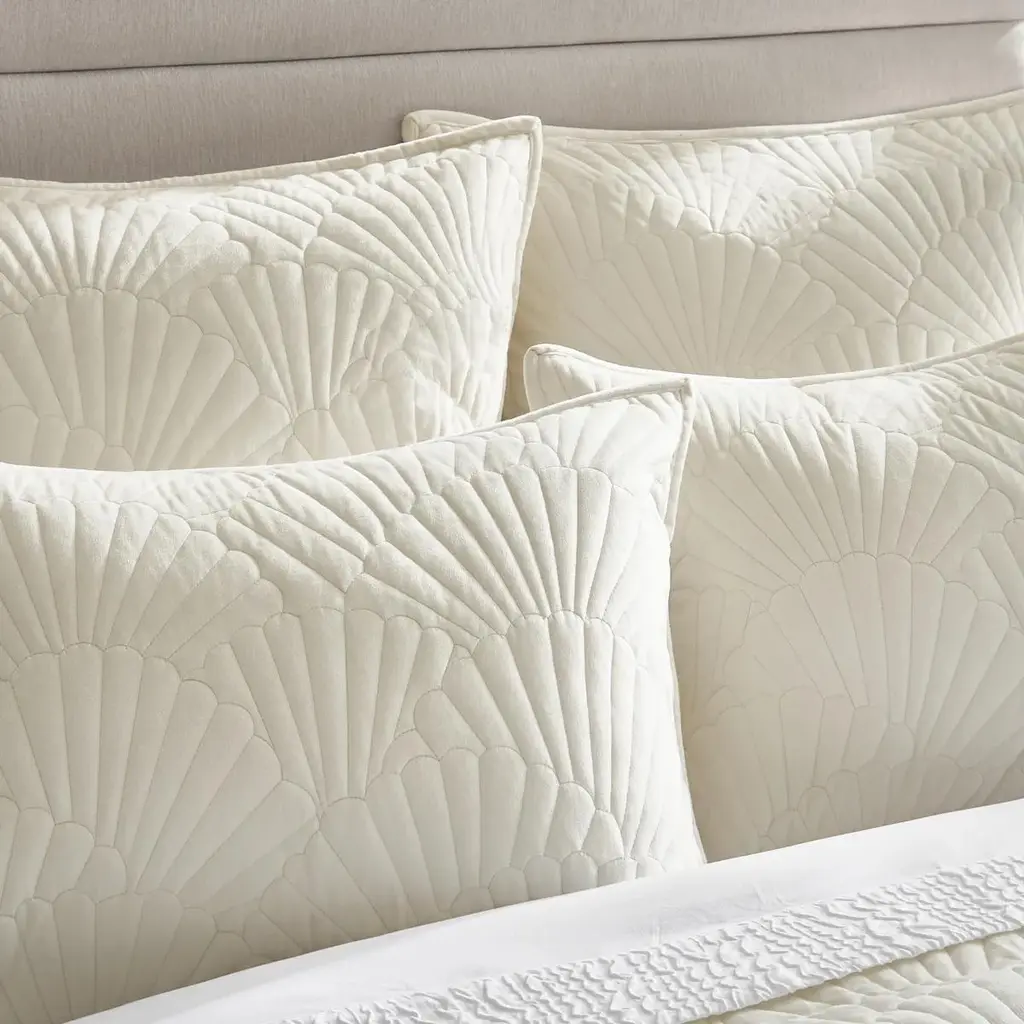 Wrap your bedroom in soft sophistication with the Fan Velvet Quilt Set in ivory. This luxurious bedding set showcases a sculptural fan quilted pattern across plush velvet for a look that feels both elegant and relaxed. The ivory hue creates an airy, calming atmosphere while adding subtle texture and light reflection. Finished with piped edges for a polished touch and filled with lightweight material for year-round comfort. Z Gallerie Exclusive.ZG Exclusive