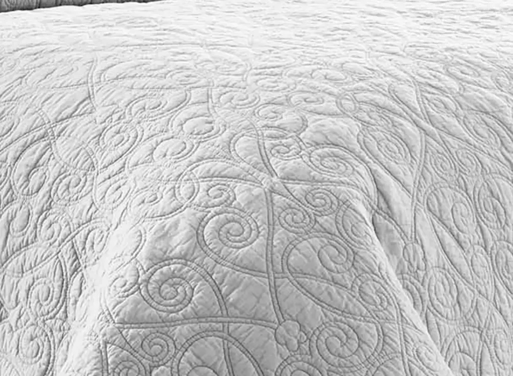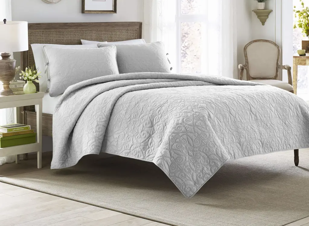 The Felicity quilt full/queen set in neutral gray is a versatile option. An elaborate scroll quilt stitch is inspired by classic ironwork trellis designs; hand tied closures on the shams add decorative detail. Prewashed for softness, becomes cozier with each wash. Filled with a blend of 80% cotton/20% polyester it is light weight yet can be layered for year-round use. Set includes one quilt and two shams. Machine washable for easy care.