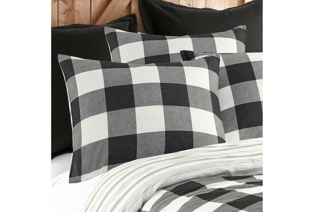 Full/queen Cotton Duvet-3 Piece Set Reversible Farmhouse Buffalo Plaid To Stripe Black | Machine Washable