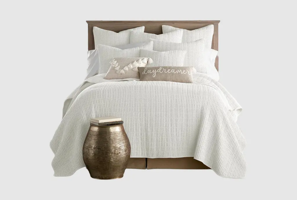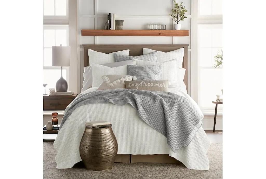 Transform your bedroom with the Full/Queen Quilt 3 Piece Set in Waffle White. This solid quilt, designed in a farmhouse style, brings a touch of simplicity and comfort to your space. Its machine washable cotton material ensures easy care and long-lasting use, making it perfect for dorm rooms or any cozy retreat.