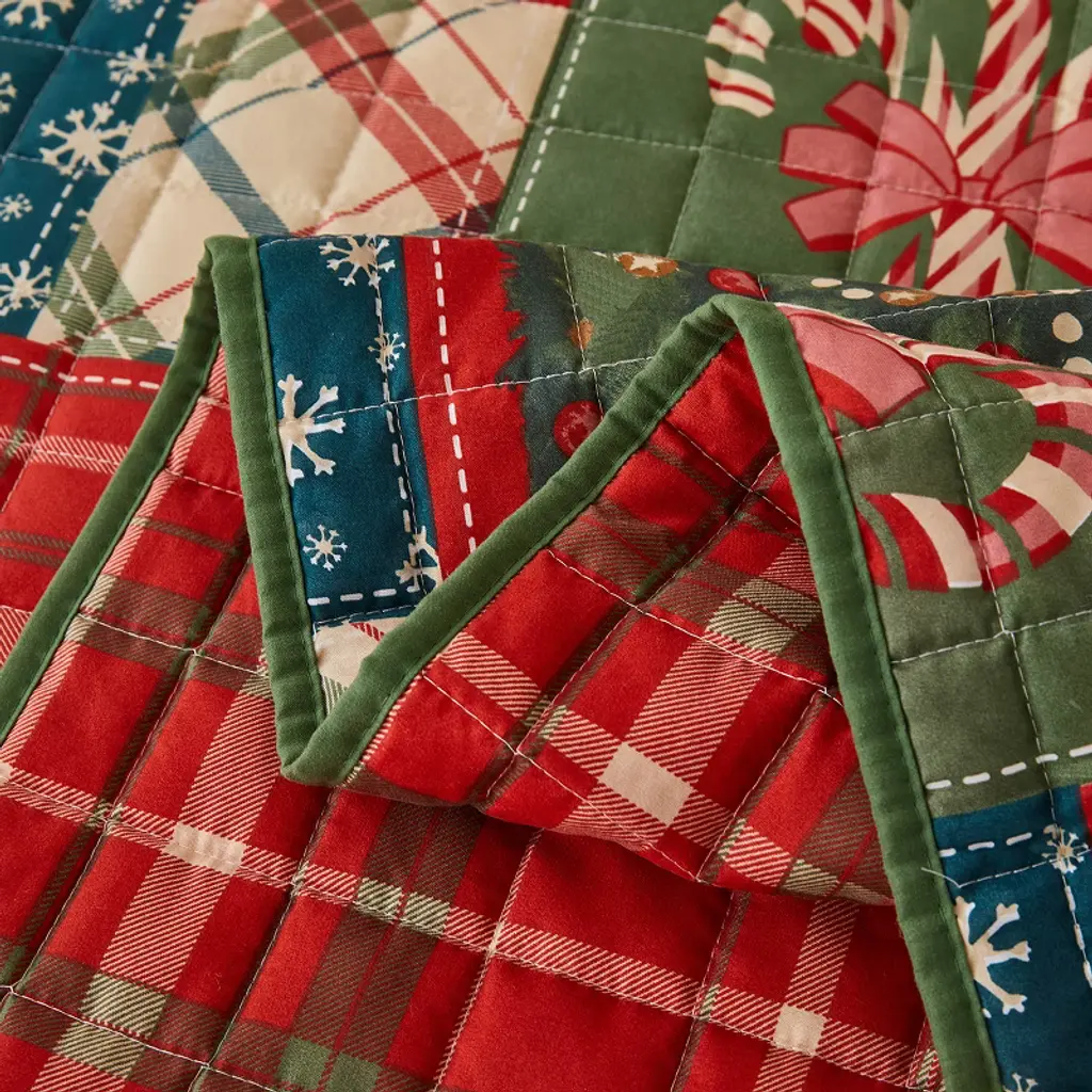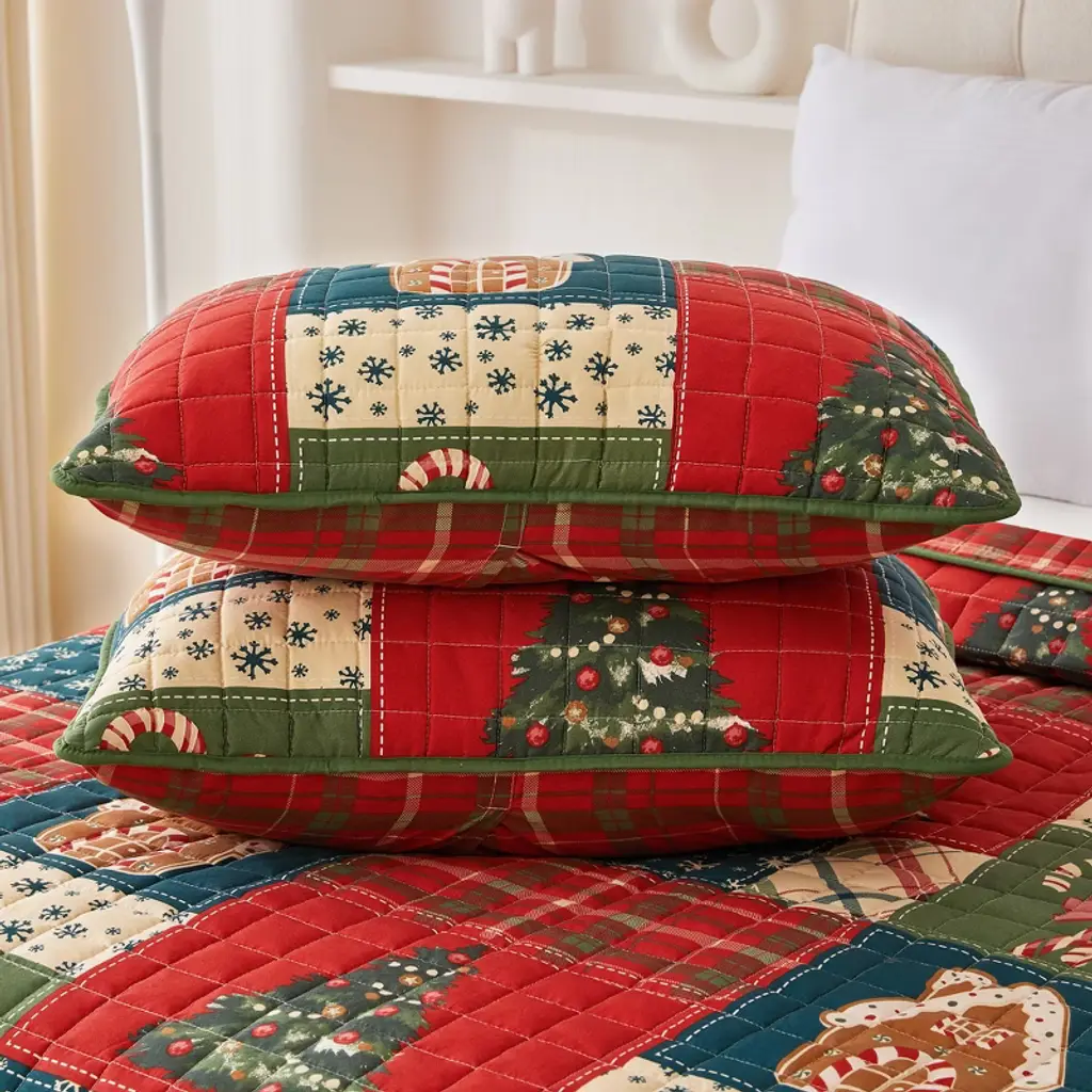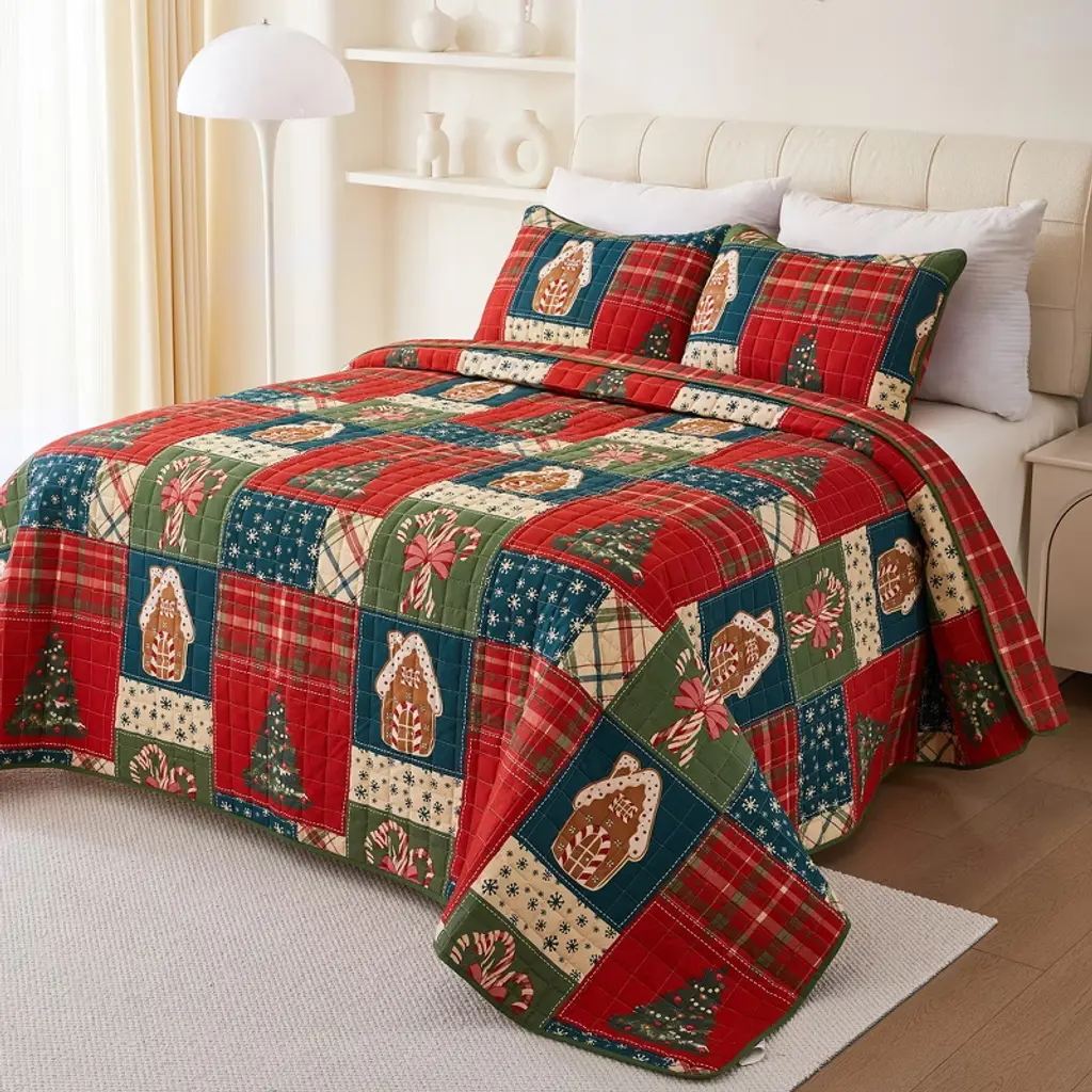 Wrap your bedroom in holiday magic with our Christmas Patchwork Quilt Set! This cozy bedspread blends festive charm and classic style, featuring a patchwork design adorned with gingerbread houses, candy canes, Christmas trees, and red-green plaids. Crafted from durable polyester, it's wrinkle-resistant, fade-proof, and perfect for welcoming guests or adding seasonal cheer to your space. The quilted construction adds texture and keeps the filling secure, while the vibrant holiday prints stay bright through countless washes. Use it as a bedspread, a decorative throw, or a cozy layer for winter nights' ideal for bedrooms, guest rooms, or even as a festive accent in your living area.