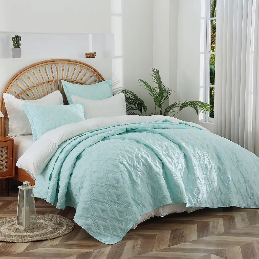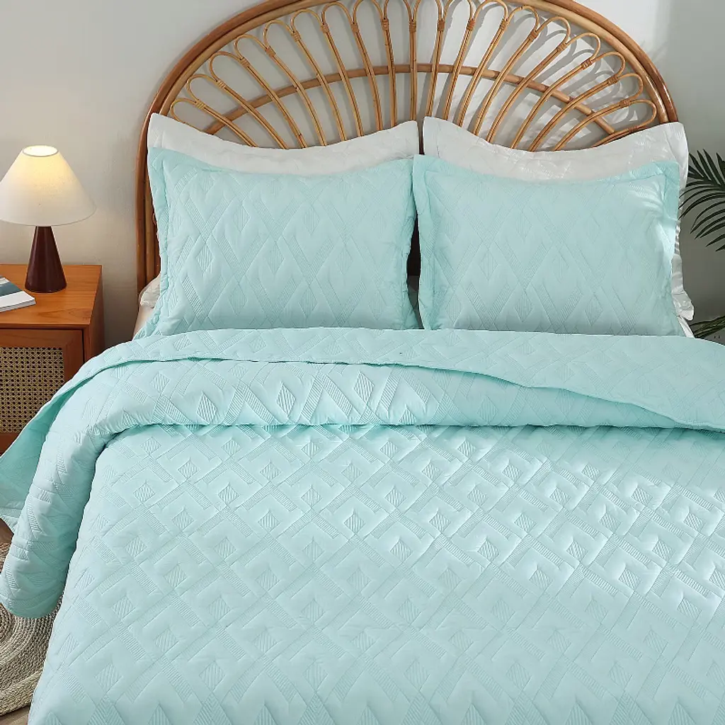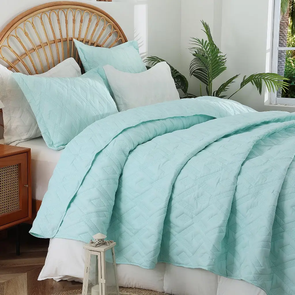 Elevate your bedroom with the cool elegance of our Mint Green Geometric Quilt Set. Designed for summer¡¯s warmth, this bedspread features a subtle, quilted geometric pattern and a refreshing mint hue that instantly calms and refreshes your space. Crafted from durable polyester, it¡¯s lightweight, wrinkle-resistant, and perfect for warm nights¡ªplus, it¡¯s machine-washable for effortless care. The quilted construction adds texture and durability, making it ideal as a standalone bedspread, light summer cover, or decorative layer. Whether styling a modern bedroom, coastal retreat, or minimalist space, this mint green set brings a touch of breezy sophistication.
