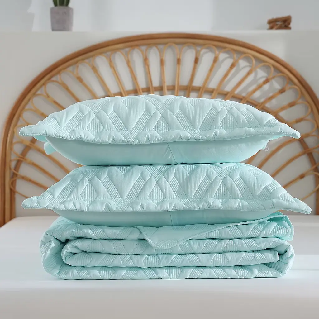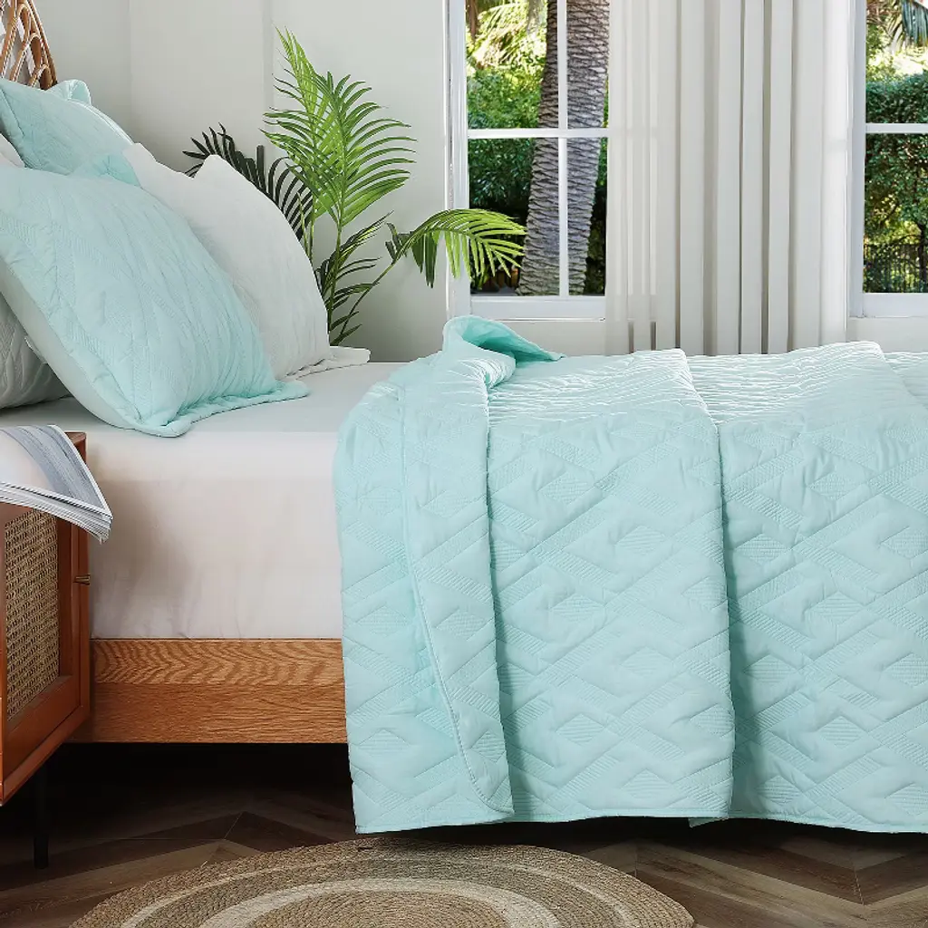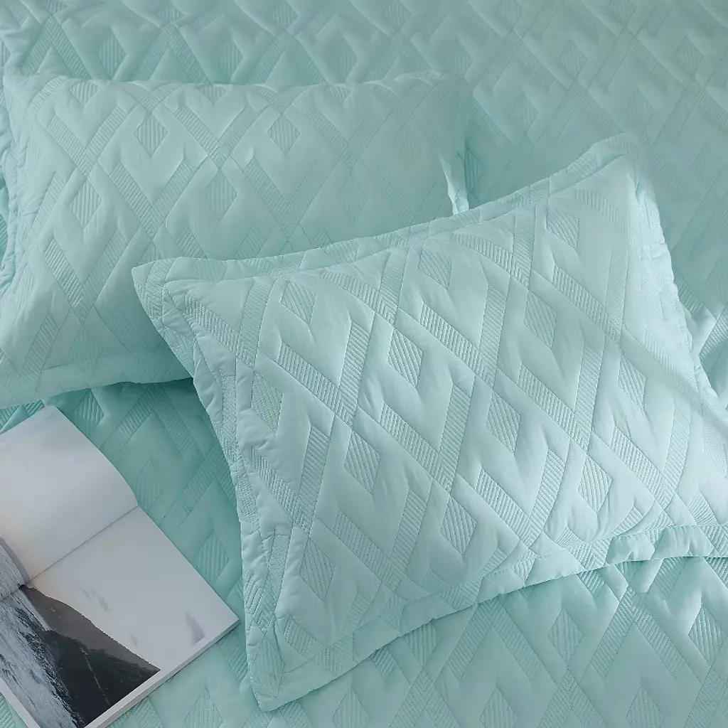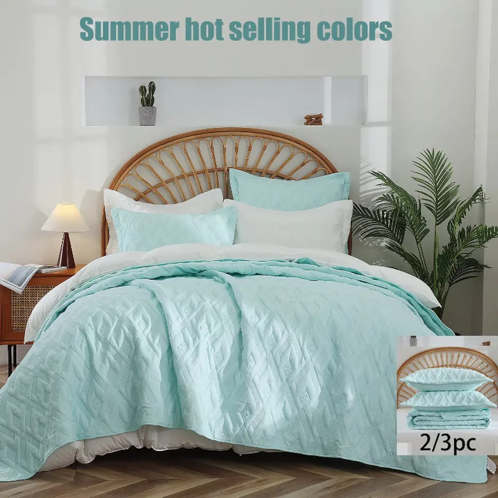 Elevate your bedroom with the cool elegance of our Mint Green Geometric Quilt Set. Designed for summer¡¯s warmth, this bedspread features a subtle, quilted geometric pattern and a refreshing mint hue that instantly calms and refreshes your space. Crafted from durable polyester, it¡¯s lightweight, wrinkle-resistant, and perfect for warm nights¡ªplus, it¡¯s machine-washable for effortless care. The quilted construction adds texture and durability, making it ideal as a standalone bedspread, light summer cover, or decorative layer. Whether styling a modern bedroom, coastal retreat, or minimalist space, this mint green set brings a touch of breezy sophistication.