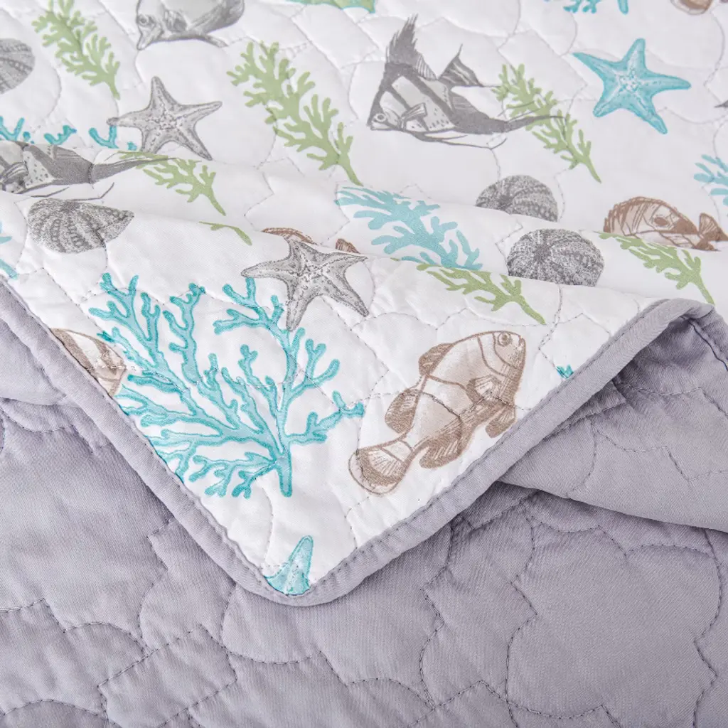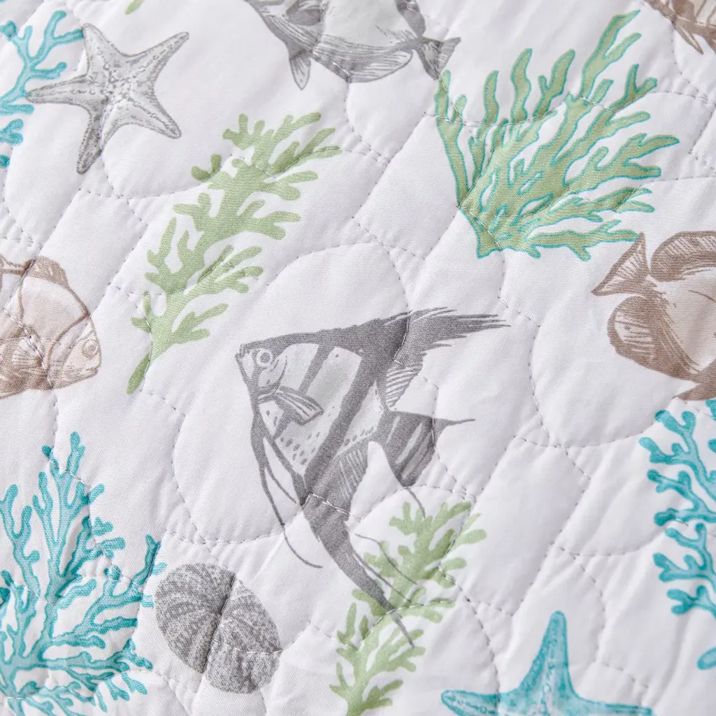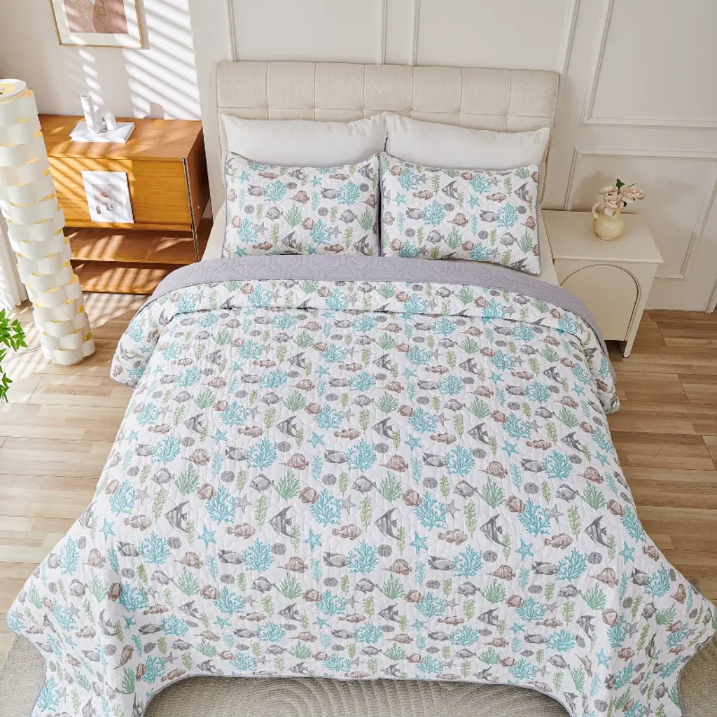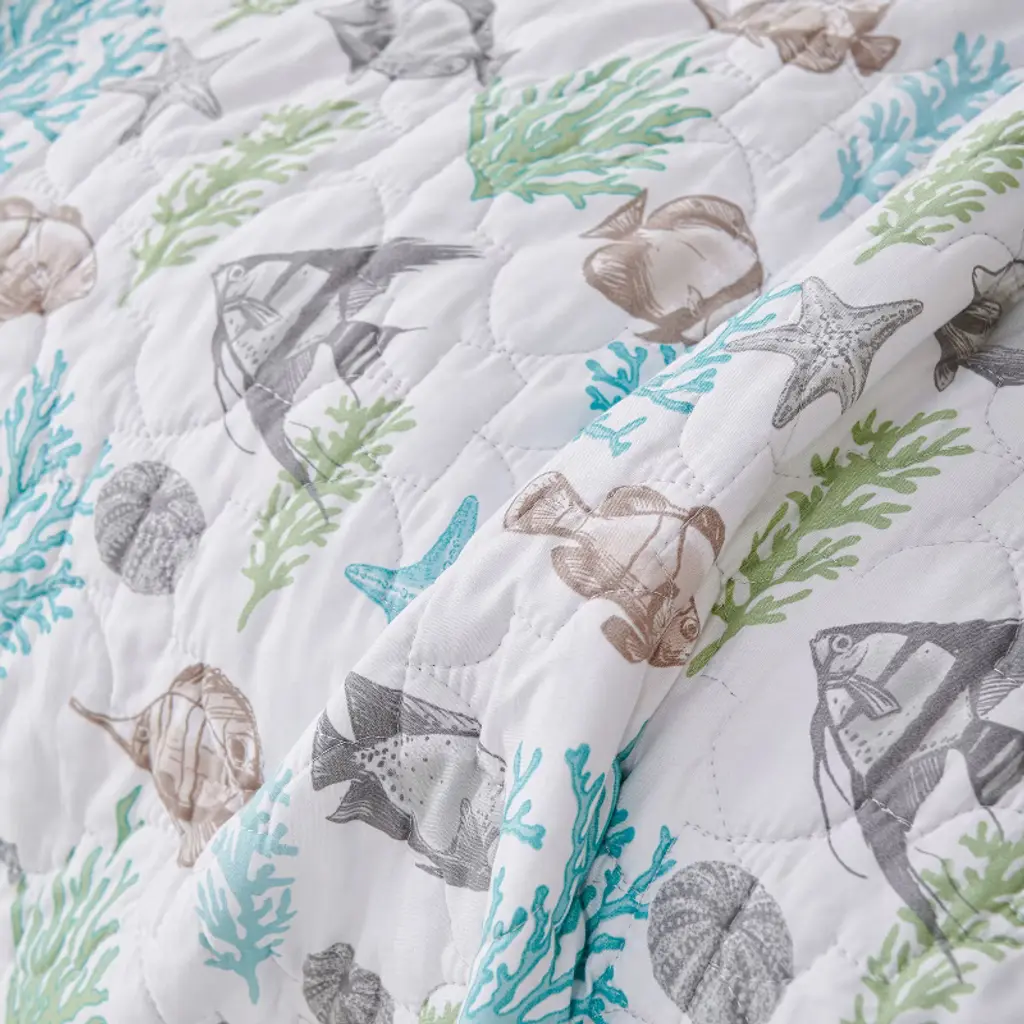 Transform your bedroom into a serene coastal escape with our Ocean Sea Life 3-Piece Quilt Set. Featuring intricate prints of fish, coral, and starfish in soft, soothing hues, this bedspread captures the beauty of the ocean in every stitch. Crafted from durable polyester, the quilt offers lasting vibrancy and easy care, while gray piping adds a polished finish. It's perfect for dressing up your bed, guest room, or beach house. The quilted construction enhances texture and durability, making it ideal for year-round use as a standalone cover or layered accent. Dive into coastal charm-no beach trip required.