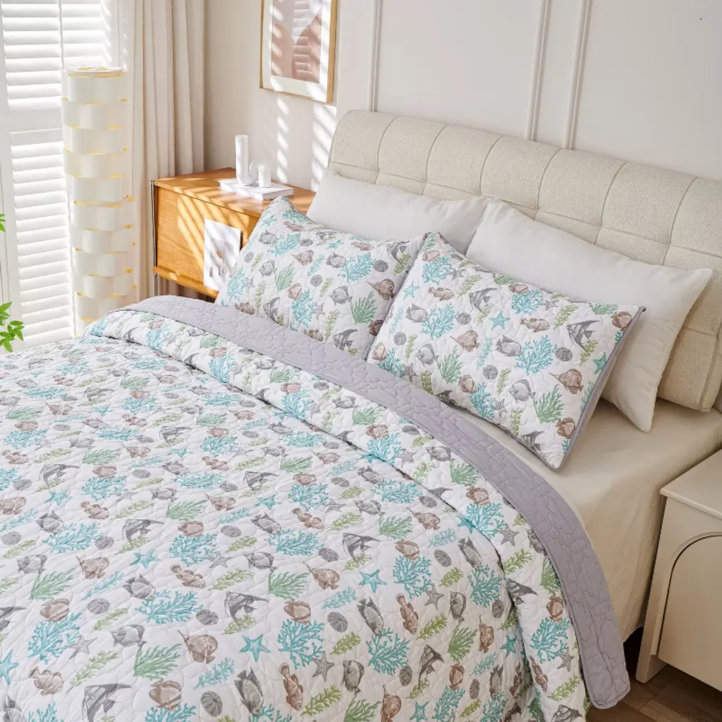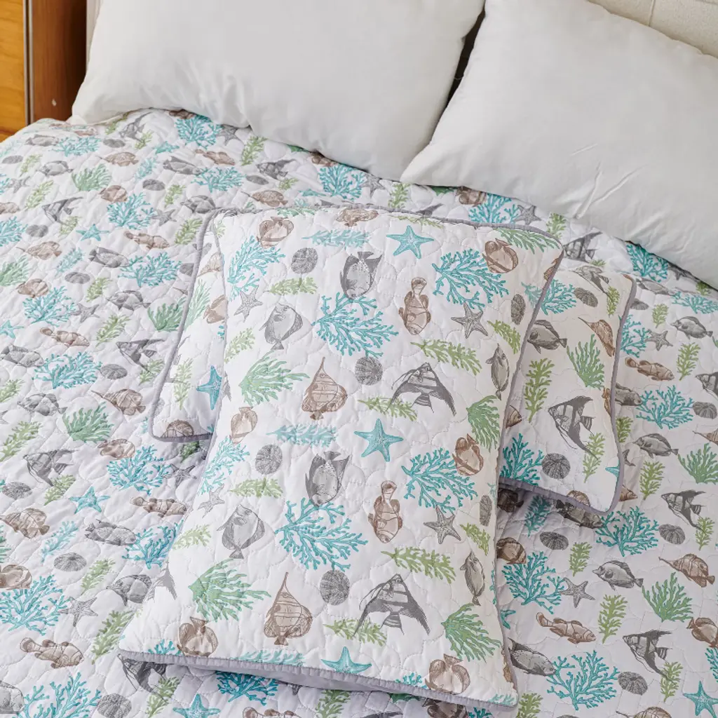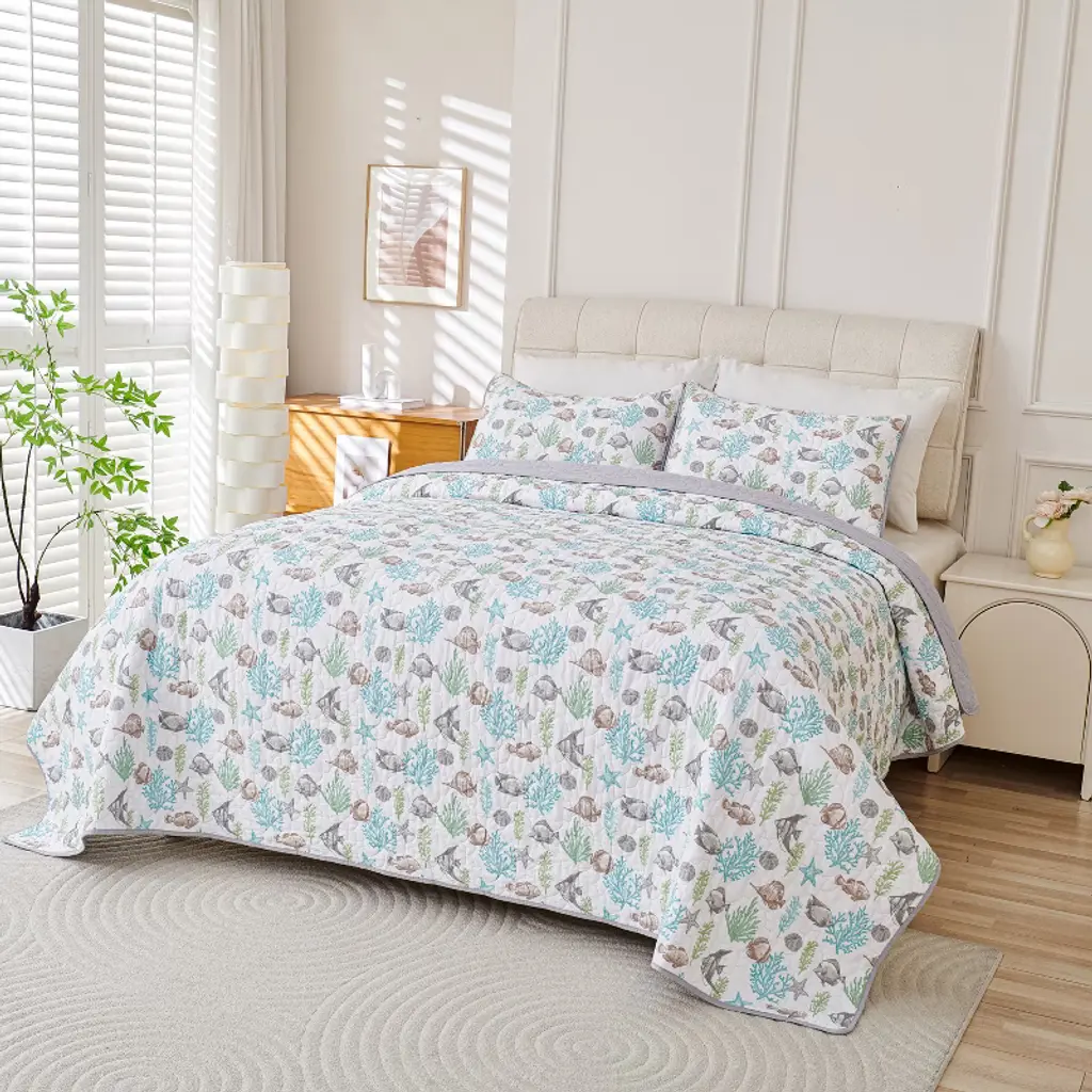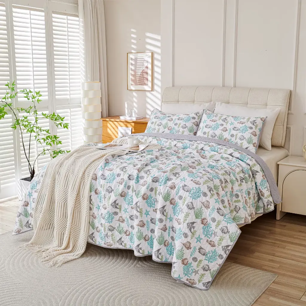Transform your bedroom into a serene coastal escape with our Ocean Sea Life 3-Piece Quilt Set. Featuring intricate prints of fish, coral, and starfish in soft, soothing hues, this bedspread captures the beauty of the ocean in every stitch. Crafted from durable polyester, the quilt offers lasting vibrancy and easy care, while gray piping adds a polished finish. It's perfect for dressing up your bed, guest room, or beach house. The quilted construction enhances texture and durability, making it ideal for year-round use as a standalone cover or layered accent. Dive into coastal charm-no beach trip required.