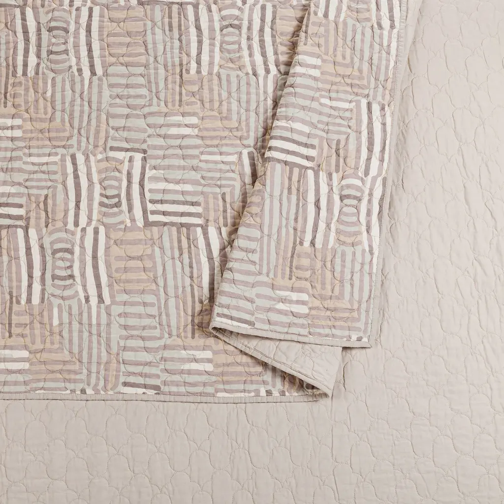 Bring a sense of calm to any bedroom with the Abrazo Quilt Set from Justina Blakeny, featuring a reversible water-colored stripe design and taupe ground.