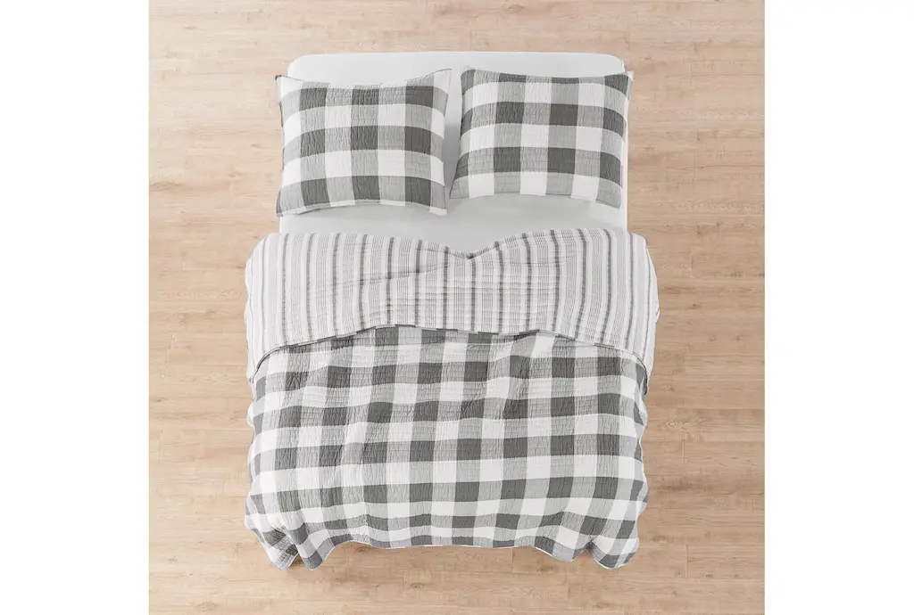 King Quilt-3 Piece Set Reversible Farmhouse Buffalo Plaid Natural Cotton To Stripe Grey | Sets | Set Of 3 | Rectangle | Quilts