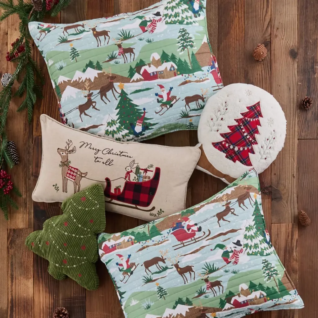 Bring playful holiday spirit to your bedroom with the Merry Mountains Quilt Set by Levtex Home. Featuring Santa, reindeer, woodland animals, and snowy mountains in a cheerful forest landscape, this quilt adds festive charm to your space. Reverses to a red and white plaid for added versatility. Made from soft cotton with a cotton-rich fill (that includes cotton, polyester and other fibers), it’s pre-washed for comfort and machine washable. Includes sham.