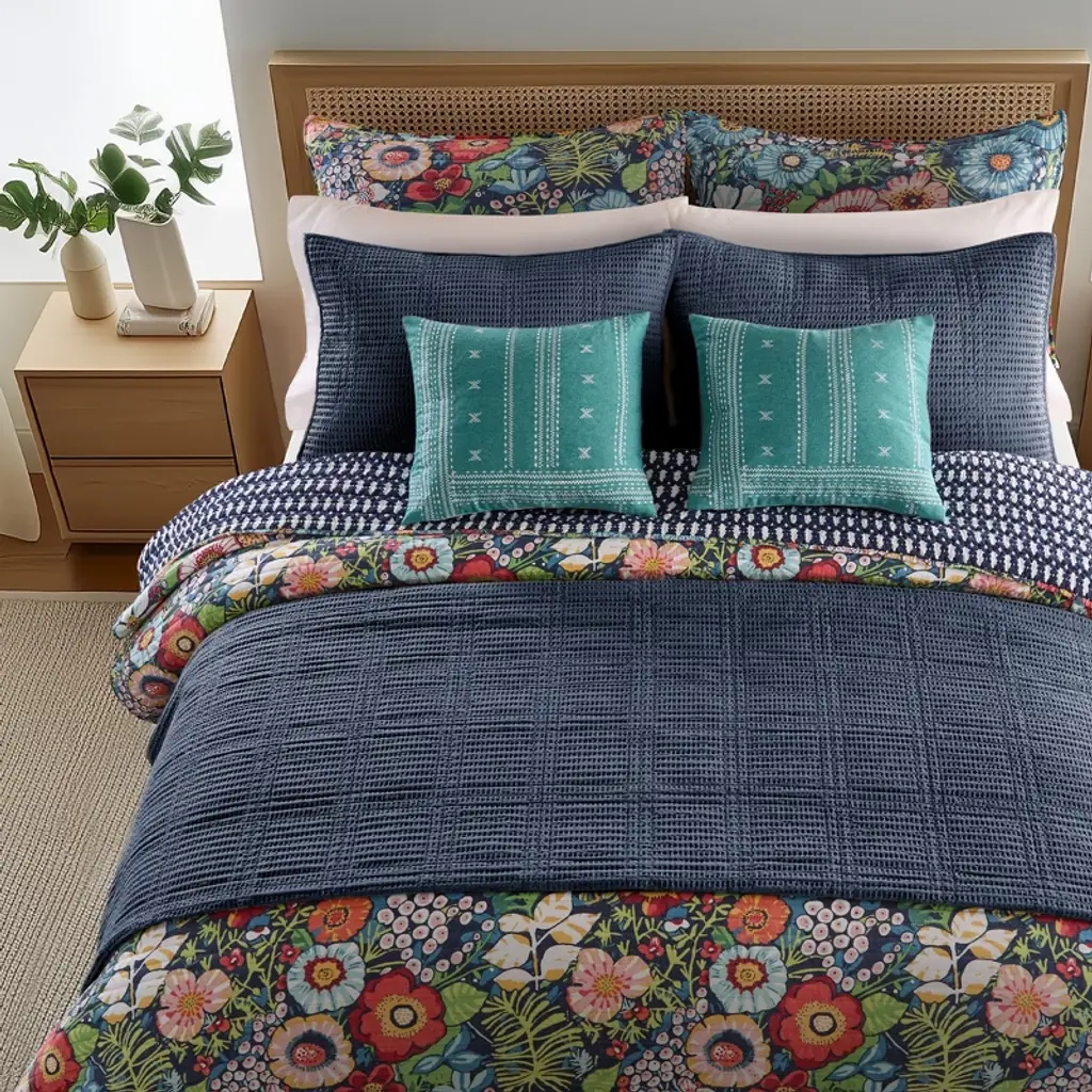 The Night Garden Reversible Quilt Set by Levtex Home is inspired by a flourishing garden. Offered in navy, red, pink, green, ochre and white, this design will immediately transform your bedroom. This reversible quilt features painterly flowers and leaves on the front, reversing to a navy ikat on a white ground. The Quilt and Sham have a rayon front and cotton back, filled with a cotton-rich filler, and are machine washable. Enjoy this for years to come!