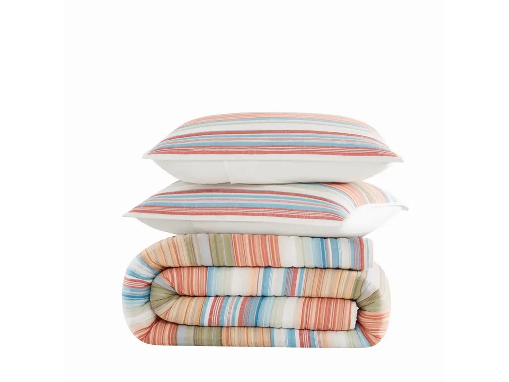 Elevate your bedroom decor with the Oceanfront Resort Palm Beach Yarn Dye Stripe Quilt Set. Beautifully crafted with a yarn-dyed pattern, this quilt set features vibrant tropical colors that evoke the warmth and relaxation of sun-soaked days on the beach. The quilt's face fabric is made from 100% cotton, providing a soft and breathable touch, while the reverse side is 100% microfiber in a natural tone solid color for added comfort. Filled with 150 GSM polyester, this quilt set offers the perfect blend of warmth and coziness. The yarn dyeing process ensures that the pattern remains vibrant, and the fabric becomes softer with each wash. The Oceanfront Resort collection is designed to transport you to a tranquil seaside getaway, with late mornings and soft bedding that embody the essence of coastal living. Enjoy the long, breezy nights and carefree summer vibes with this exquisite quilt set. Rest assured, it is made responsibly and carries the OEKO-TEX Standard 100 Certification, ensuring it is free from harmful substances. Experience the ultimate in tropical elegance and comfort with the Oceanfront Resort Palm Beach Yarn Dye Stripe Quilt Set. Combining bright, beach-inspired colors, superior softness, and exceptional quality, this quilt set is the perfect addition to your bedroom for an unmatched sleeping experience.