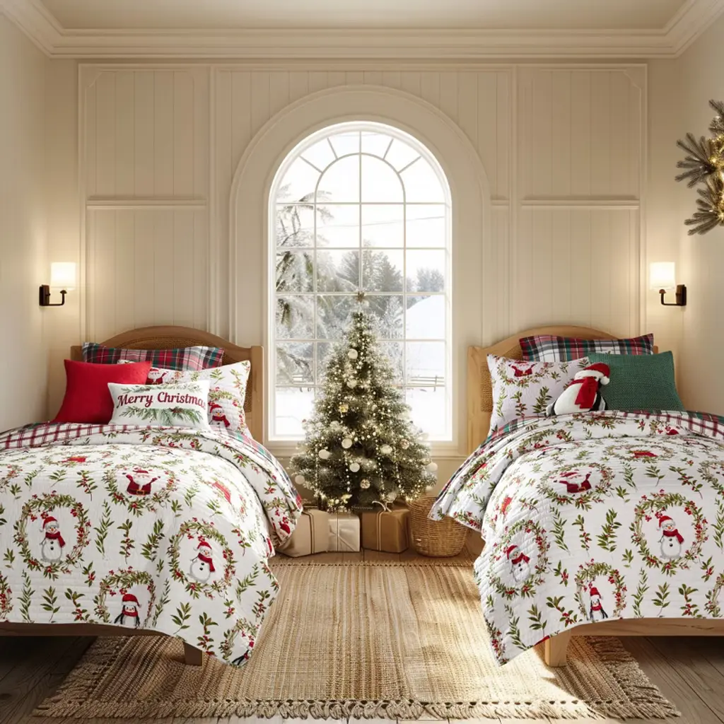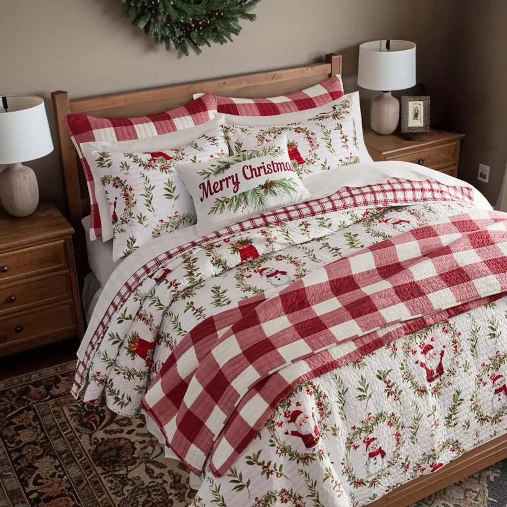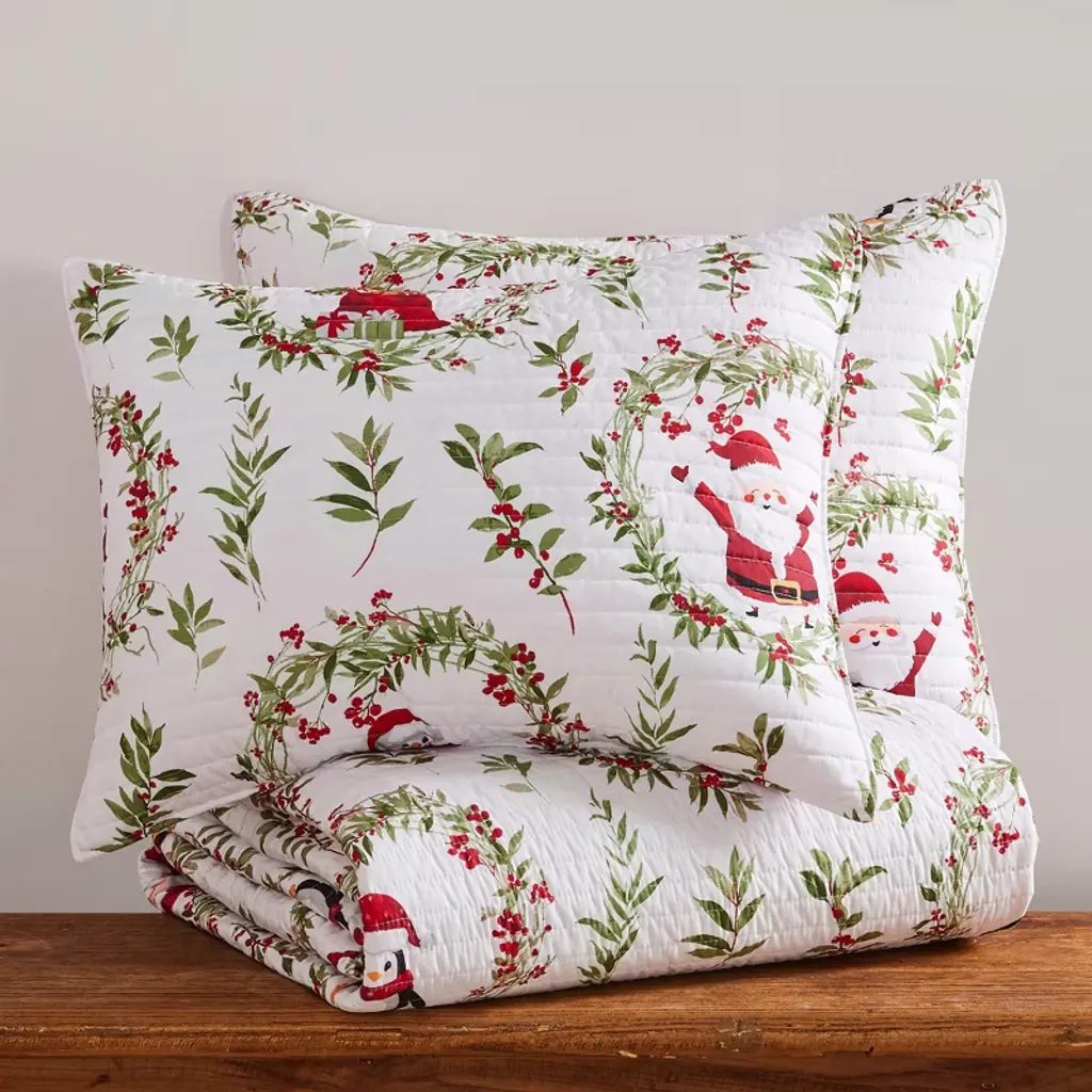 The Pine & Plaid Reversible Quilt Set by Levtex Home is inspired by the joy and fun of the Christmas holidays. Offered in classic red, white and green, this design will immediately transform your bedroom. This reversible quilt features cheerful wreath portraits of holiday icons on the front, reversing to a small red and white plaid on the back. The Quilt and Sham have a microfiber front and back, filled with a cotton-rich filler, and are machine washable. Enjoy this for years to come!