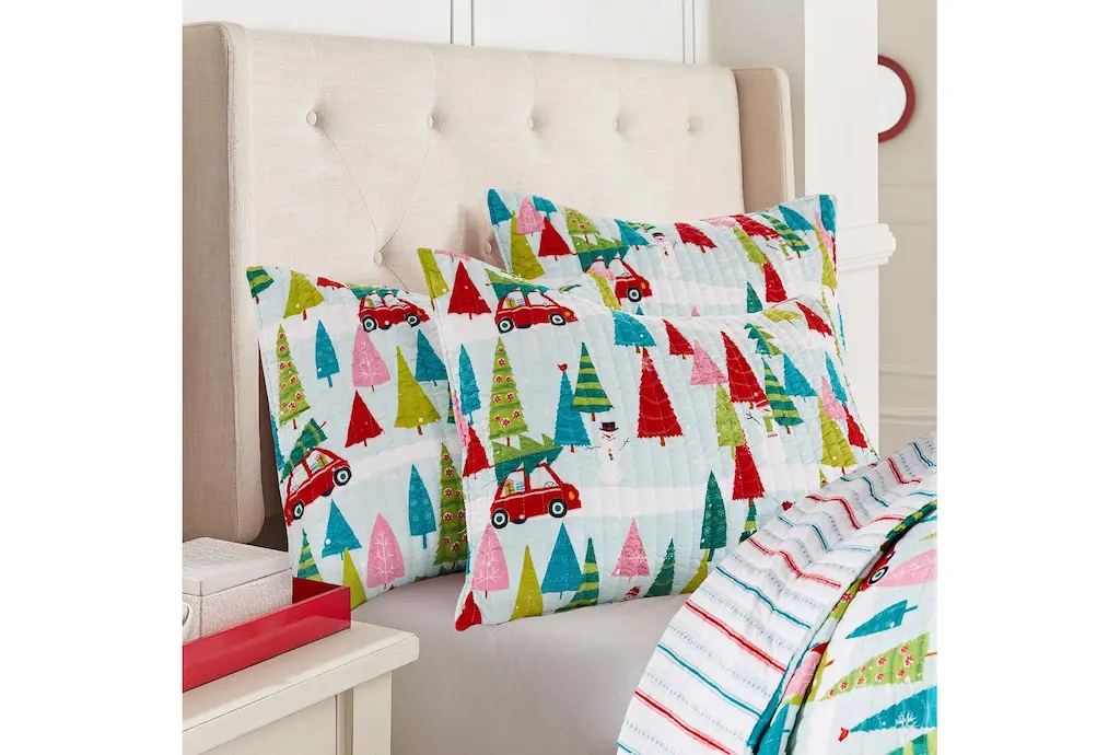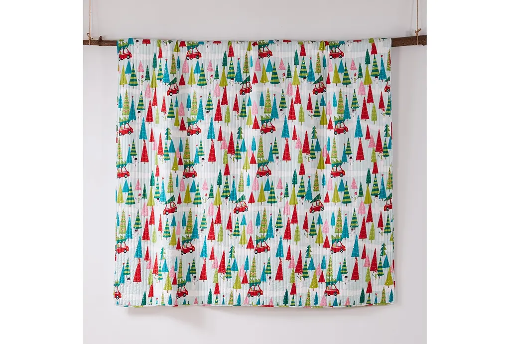 Transform your child's room with the Twin Quilt - Reversible Multi Trees To Multi Stripe. This modern quilt features a delightful design that includes a mix of white, red, teal, green, and pink colors, perfect for adding a vibrant touch to any bedroom decor. Made from durable polyester, this quilt ensures a cozy and comfortable night's sleep.