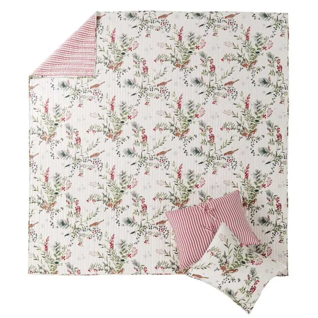 The Winterberry Forest Reversible Quilt Set by Levtex Home is inspired by a lively forest scene. Offered in green, red, grey and cream, this design will immediately transform your bedroom. This reversible quilt features a toss of leafy branches with spruce needles, flowers, berries and songbirds on the front, reversing to a classic Christmas plaid on the back. The Quilt and Shams are made from cotton, filled with a cotton-rich filler, and are machine washable. Enjoy this for years to come!