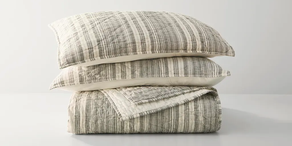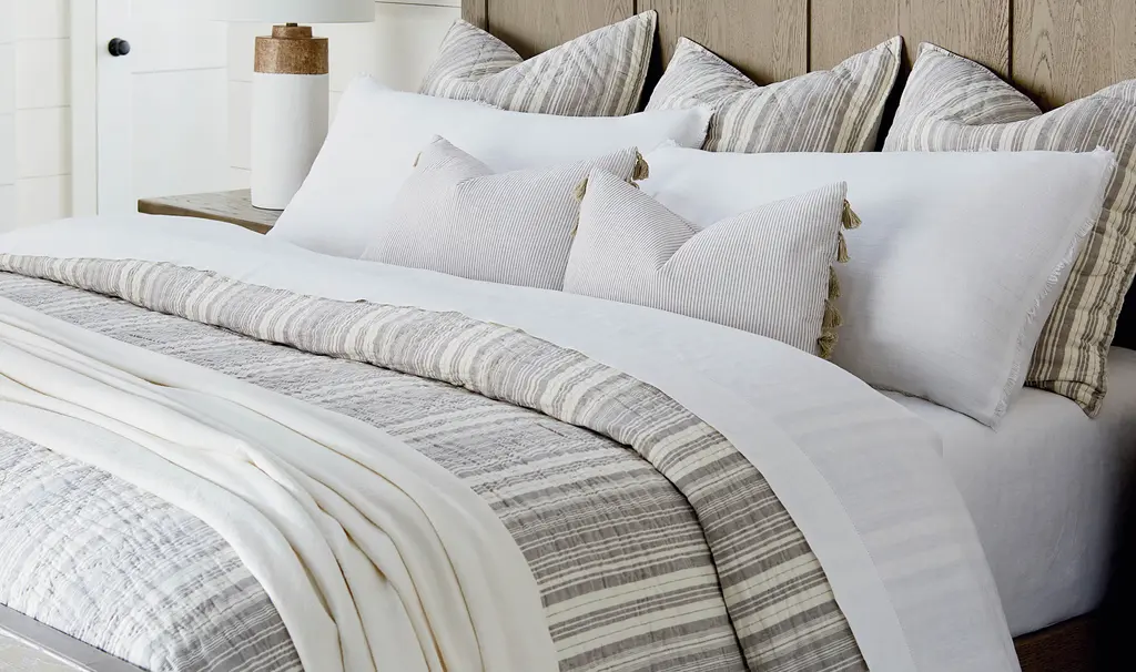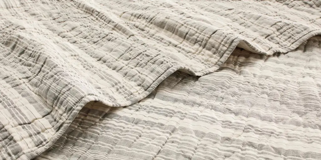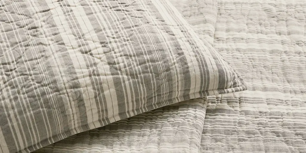 Fine linen and cotton are yarn dyed and woven together to create Aidens complex unbalanced stripe. Hand-quilted for a soft finish. The sky is the limit for styling this versatile stripe! Available in 2 neutral colorways.